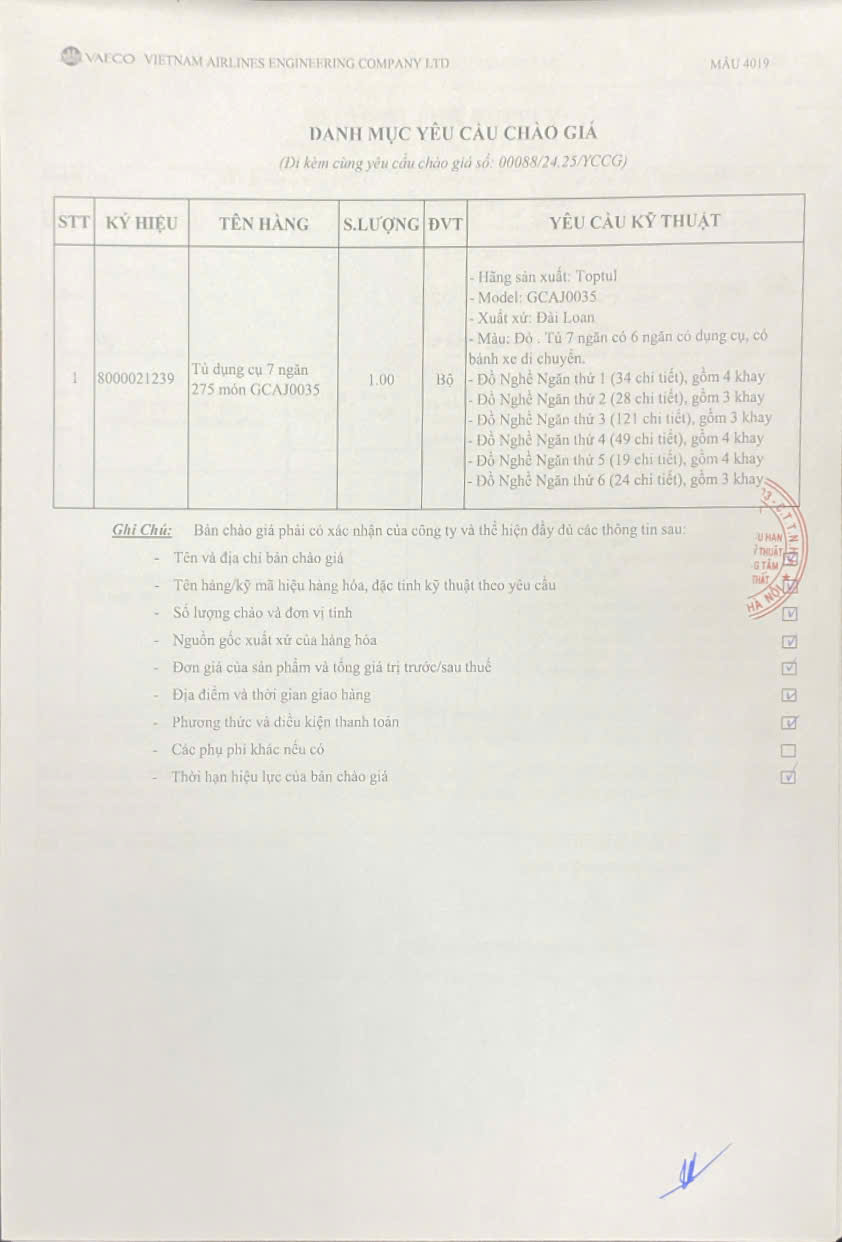 Chi nhánh bảo dưỡng Nội Thất thuộc Công ty TNHH MTV kỹ thuật máy bay (VAECO) có nhu cầu đặt hàng mua các sản phẩm theo danh mục yêu cầu chào giá . Đính kèm là chi tiết danh mục yêu cầu chào giá.