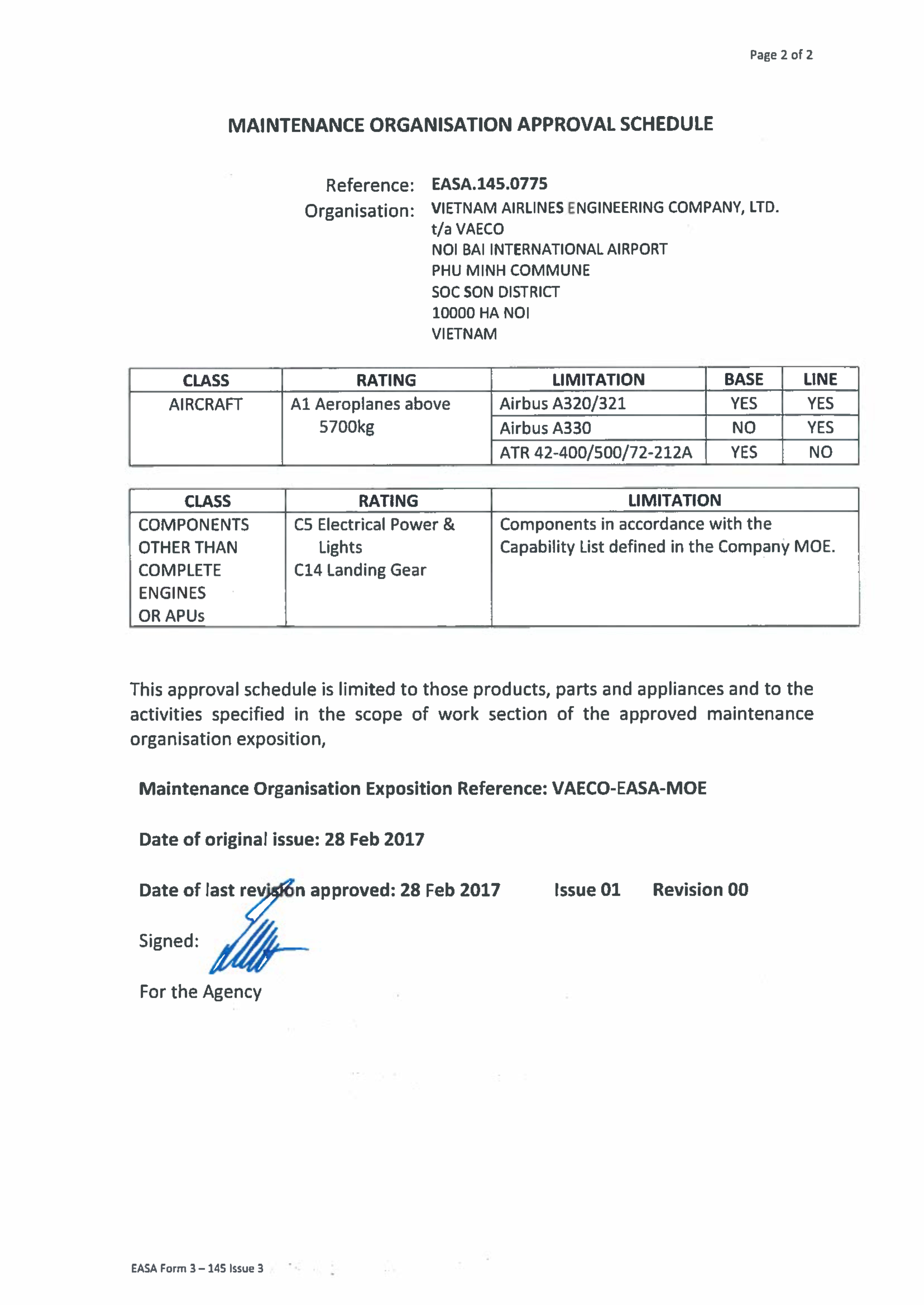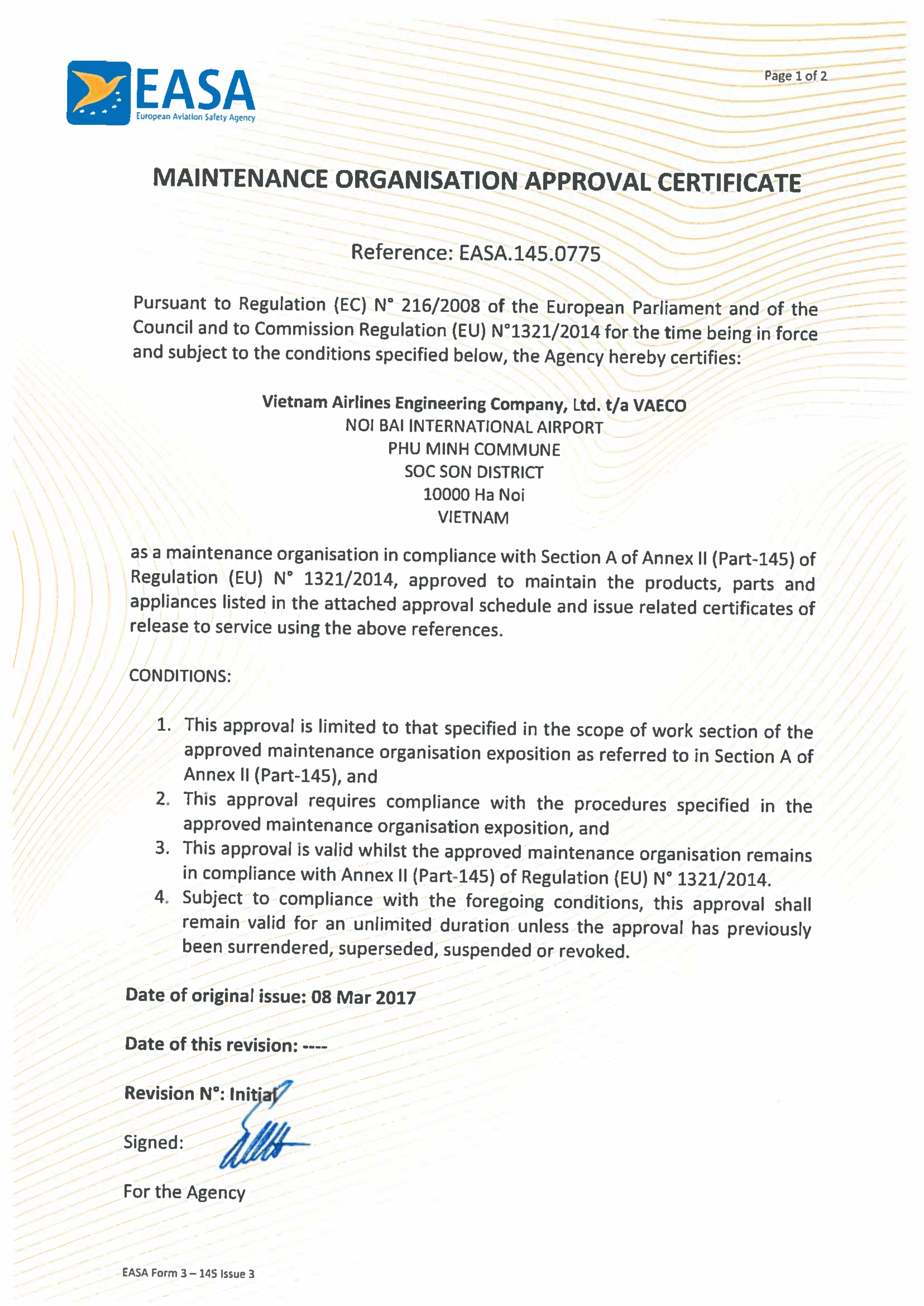 On March 8th, 2017 VAECO honorably received EASA part 145 certification from the European Aviation Safety Agency - one of the important certifications in the aircraft maintenance, repair and overhaul business. Being EASA145 approved (as well as FAR 145 approved in 2010), VAECO has manifested its capability and standing, as well as being a premise to extend its capacity in providing aircraft maintenance services not only to Vietnam Airlines JSC but also to other customers in the region and worldwide.