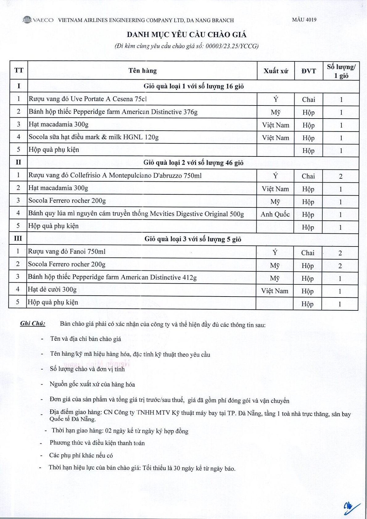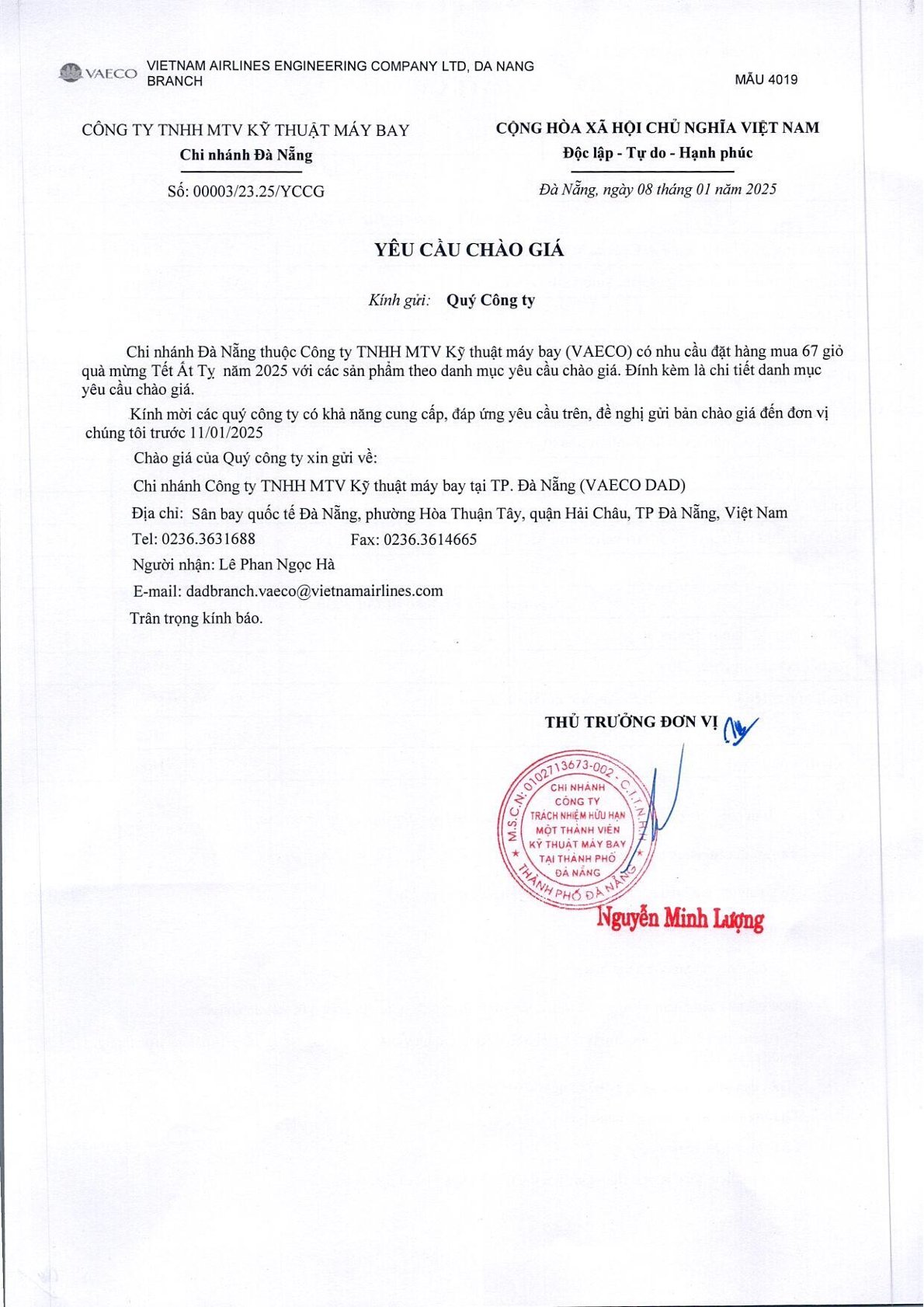 Chi nhánh Đà Nẵng thuộc Công ty TNHH MTV Kỹ thuật máy bay (VAECO) có nhu cầu đặt hàng mua 67 giỏ quà mừng Tết Ất Tỵ năm 2025 với các sản phẩm theo danh mục yêu cầu chào giá. Chi tiết danh mục yêu cầu chào giá trong file ảnh dưới đây.