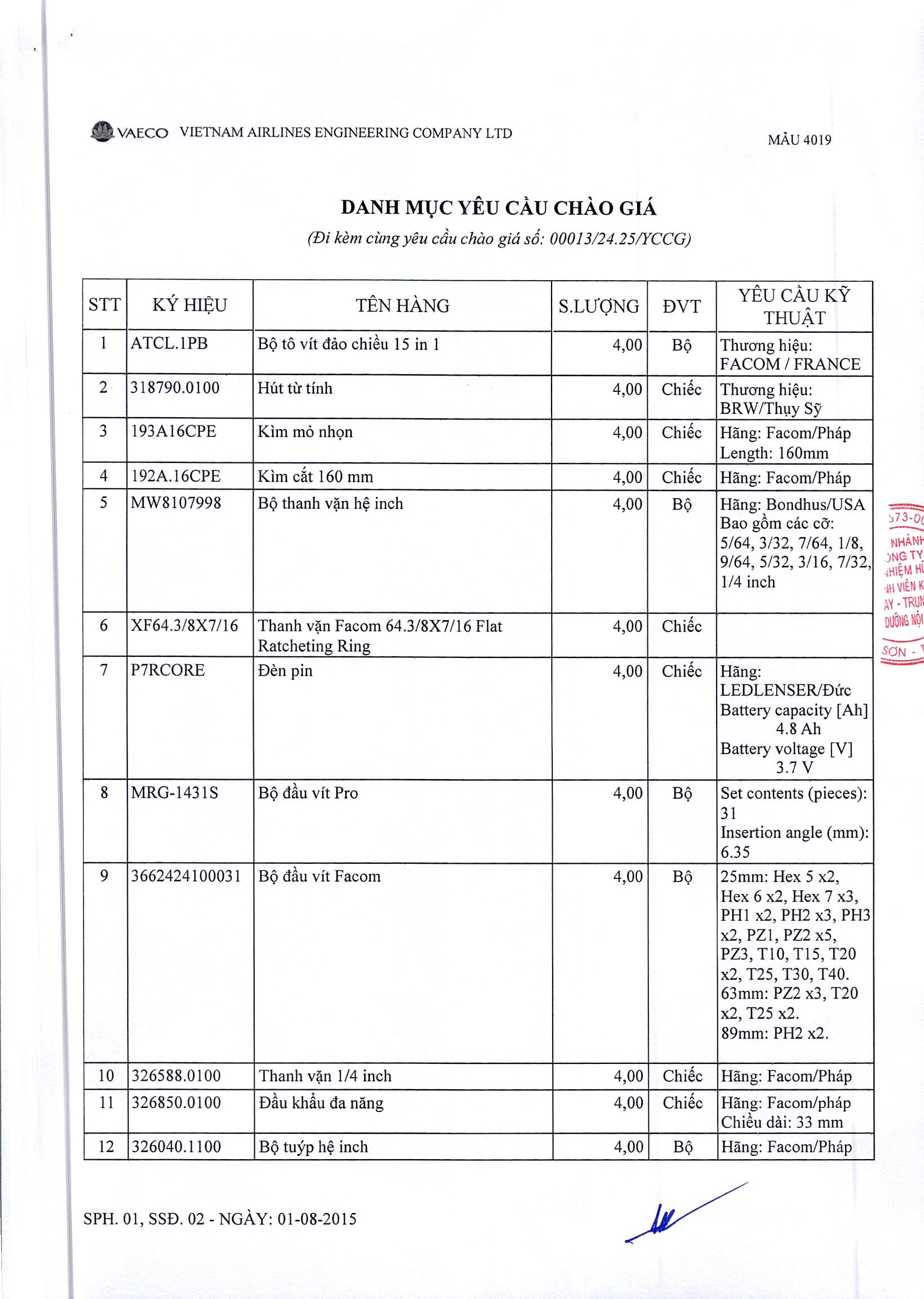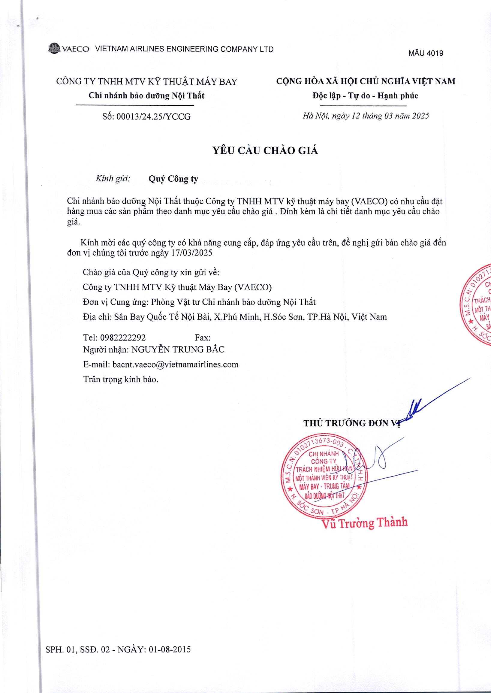 Chi nhánh bảo dưỡng Nội Thất thuộc Công ty TNHH MTV kỹ thuật máy bay (VAECO) có nhu cầu đặt hàng mua các sản phẩm theo danh mục yêu cầu chào giá . Đính kèm là chi tiết danh mục yêu cầu chào giá.