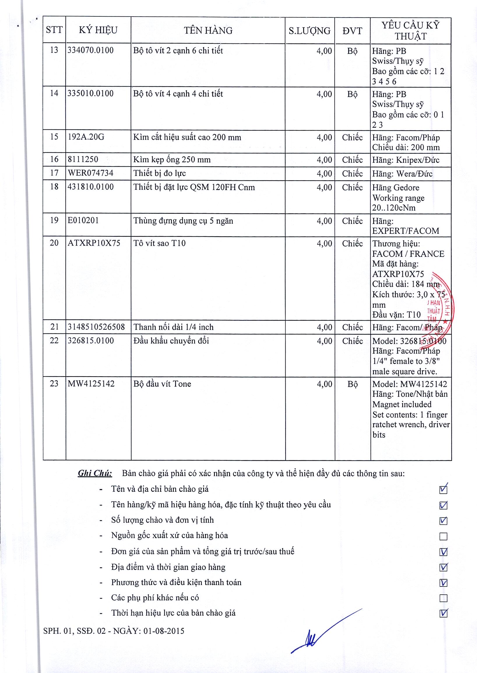 Đơn vị Cung ứng: Phòng Vật tư Chi nhánh bảo dưỡng Nội Thất
