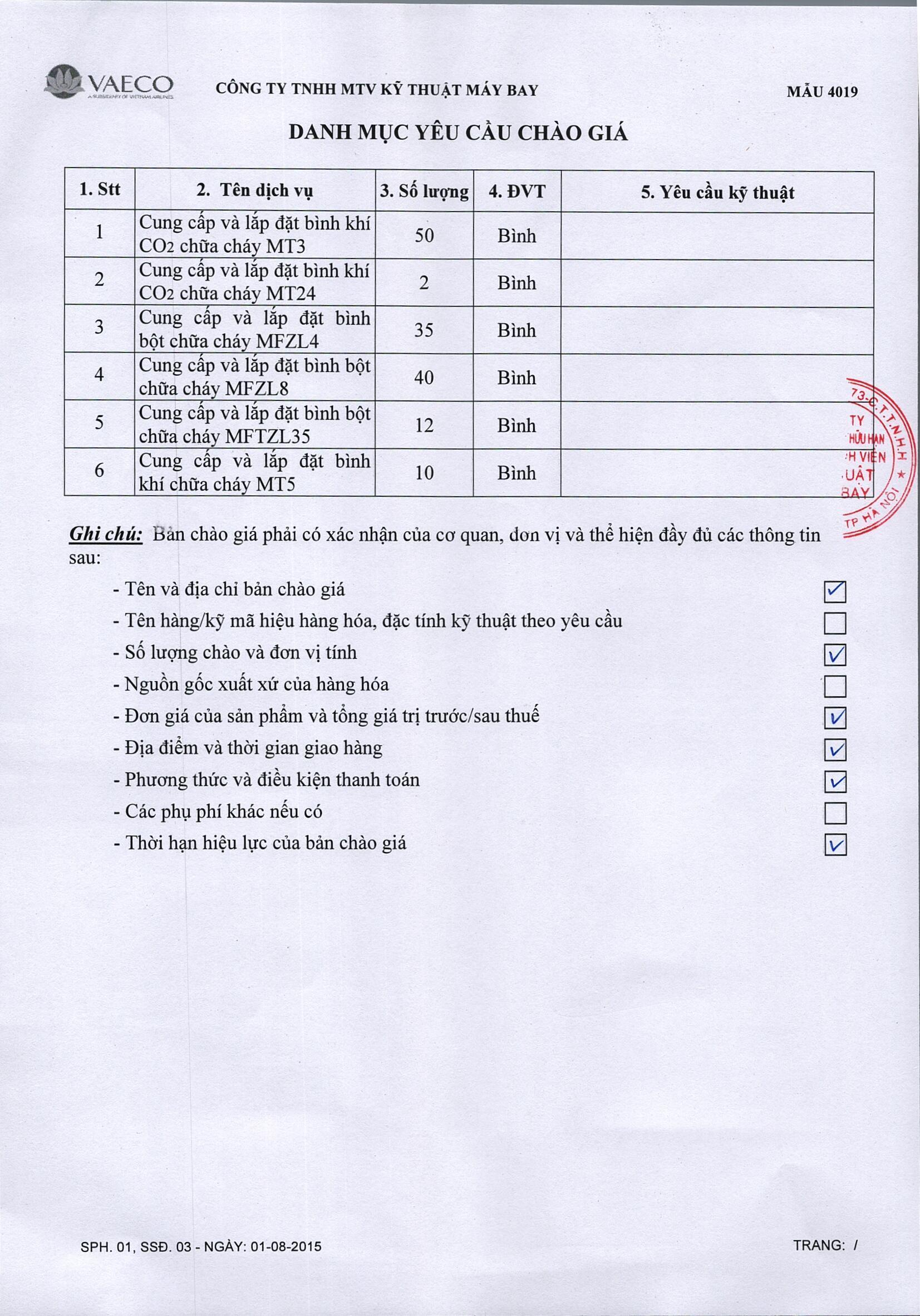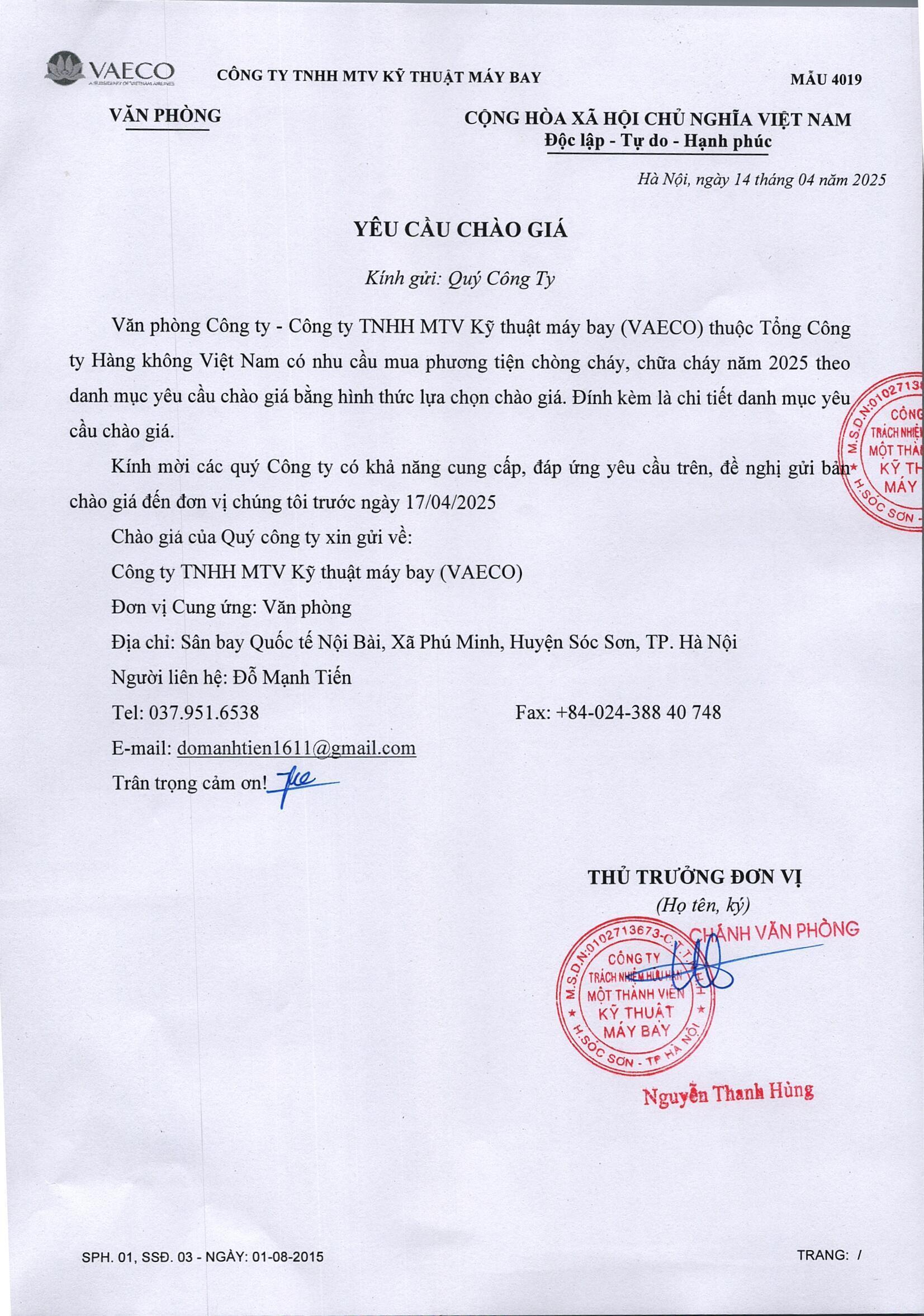 Yêu cầu chào giá gói hàng hóa "Bổ sung phương tiện phòng cháy, chữa cháy khu vực Nội Bài năm 2025"