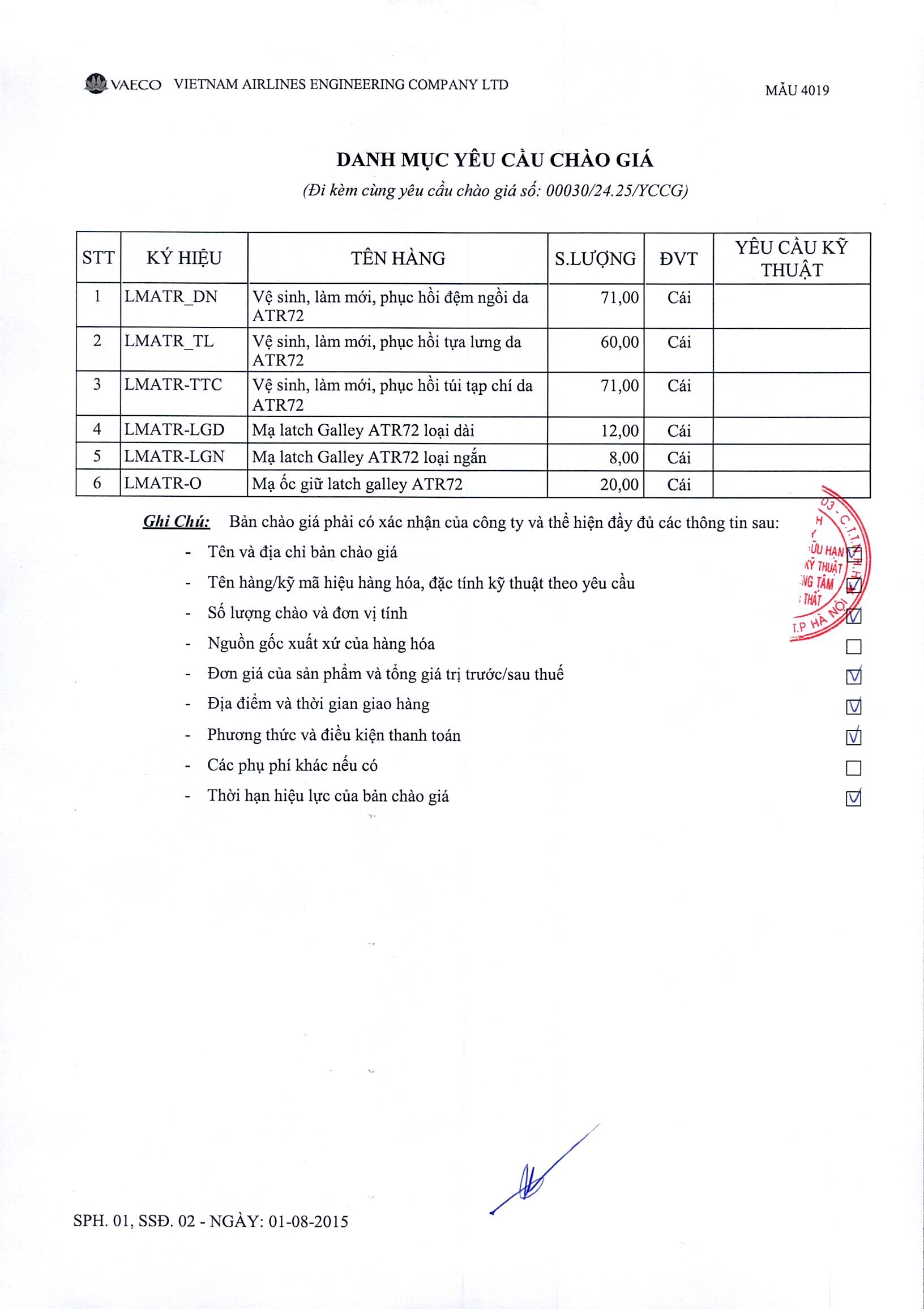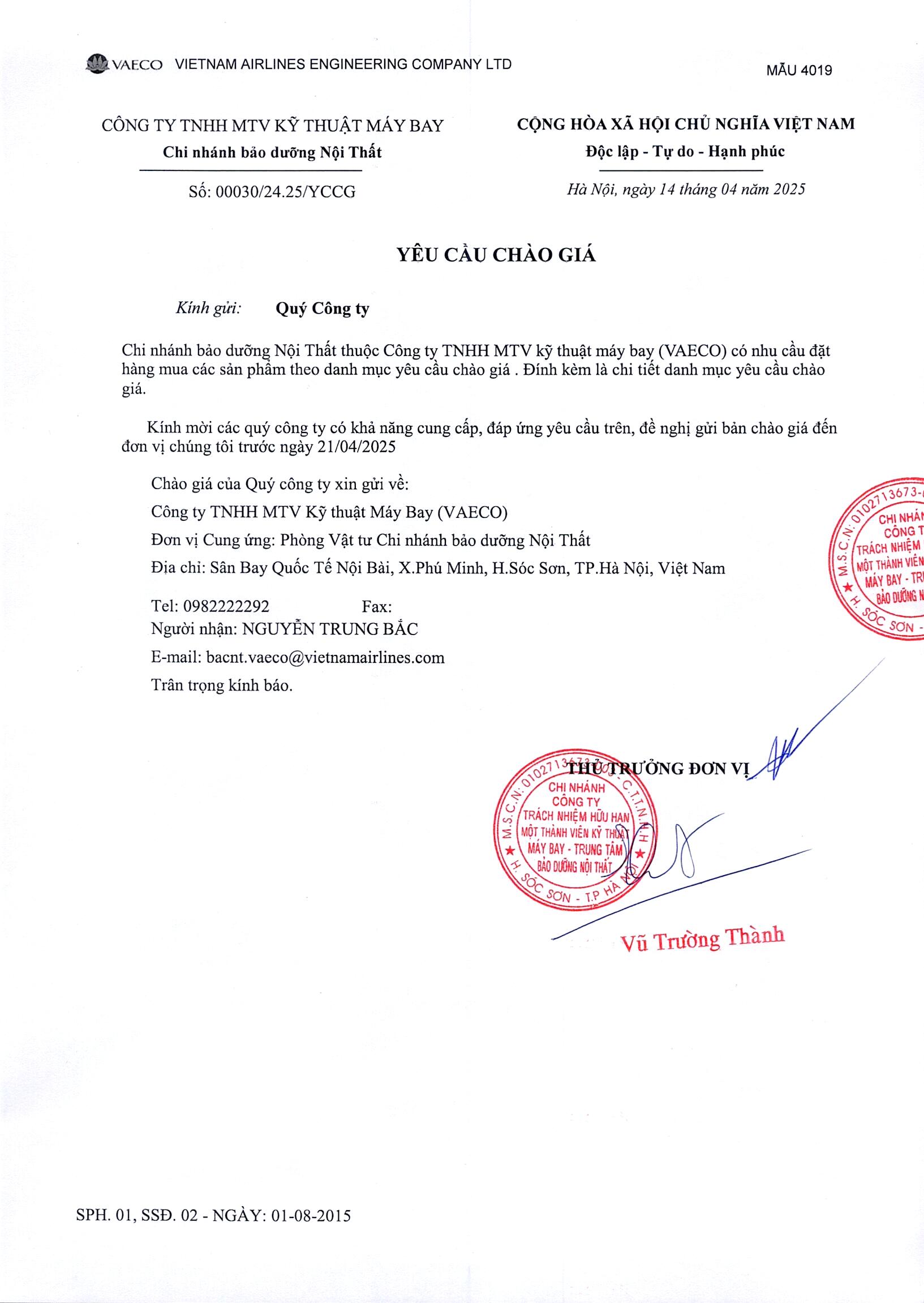 Chi nhánh bảo dưỡng Nội Thất thuộc Công ty TNHH MTV kỹ thuật máy bay (VAECO) có nhu cầu đặt hàng mua các sản phẩm theo danh mục yêu cầu chào giá . Đính kèm là chi tiết danh mục yêu cầu chào giá.