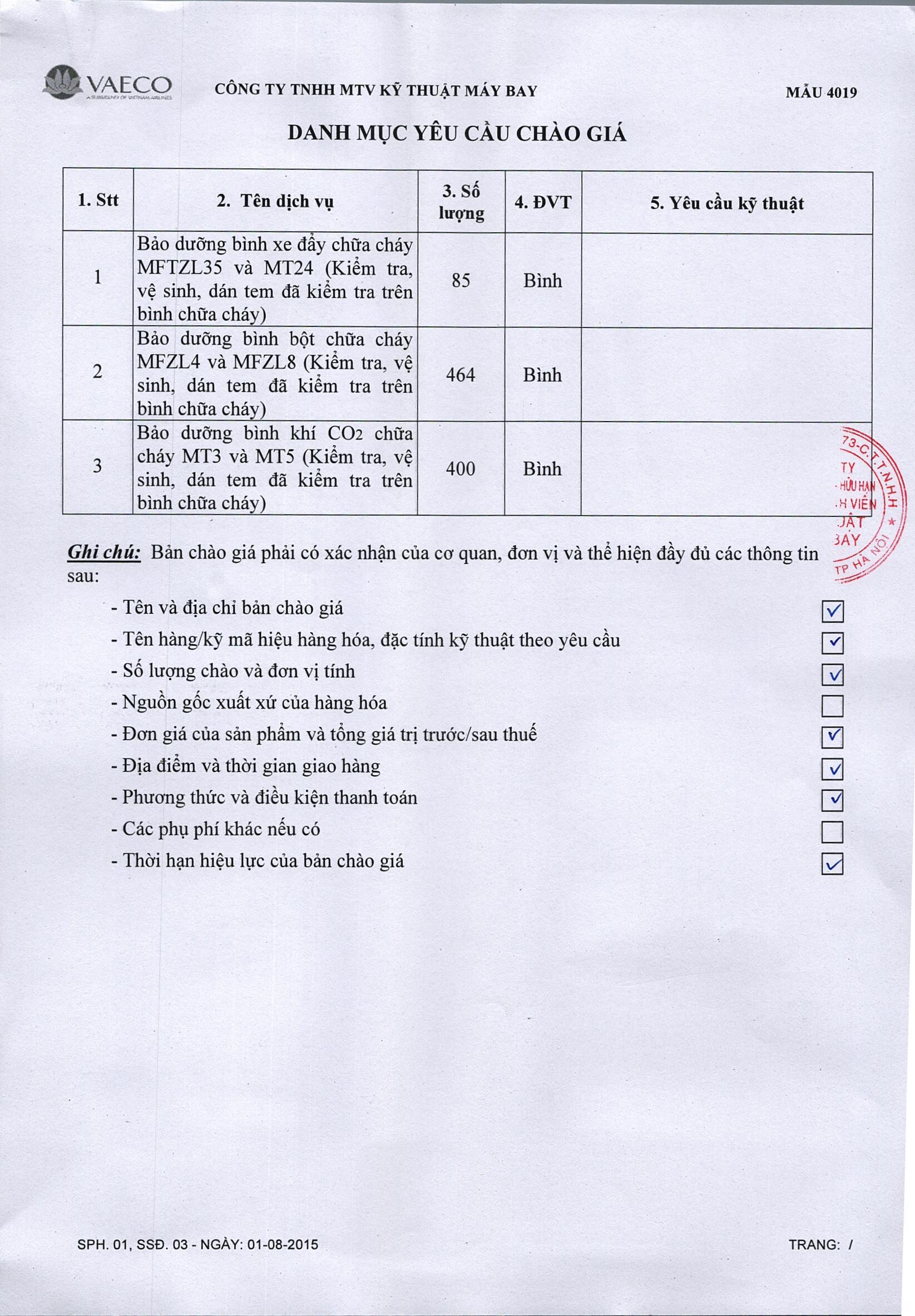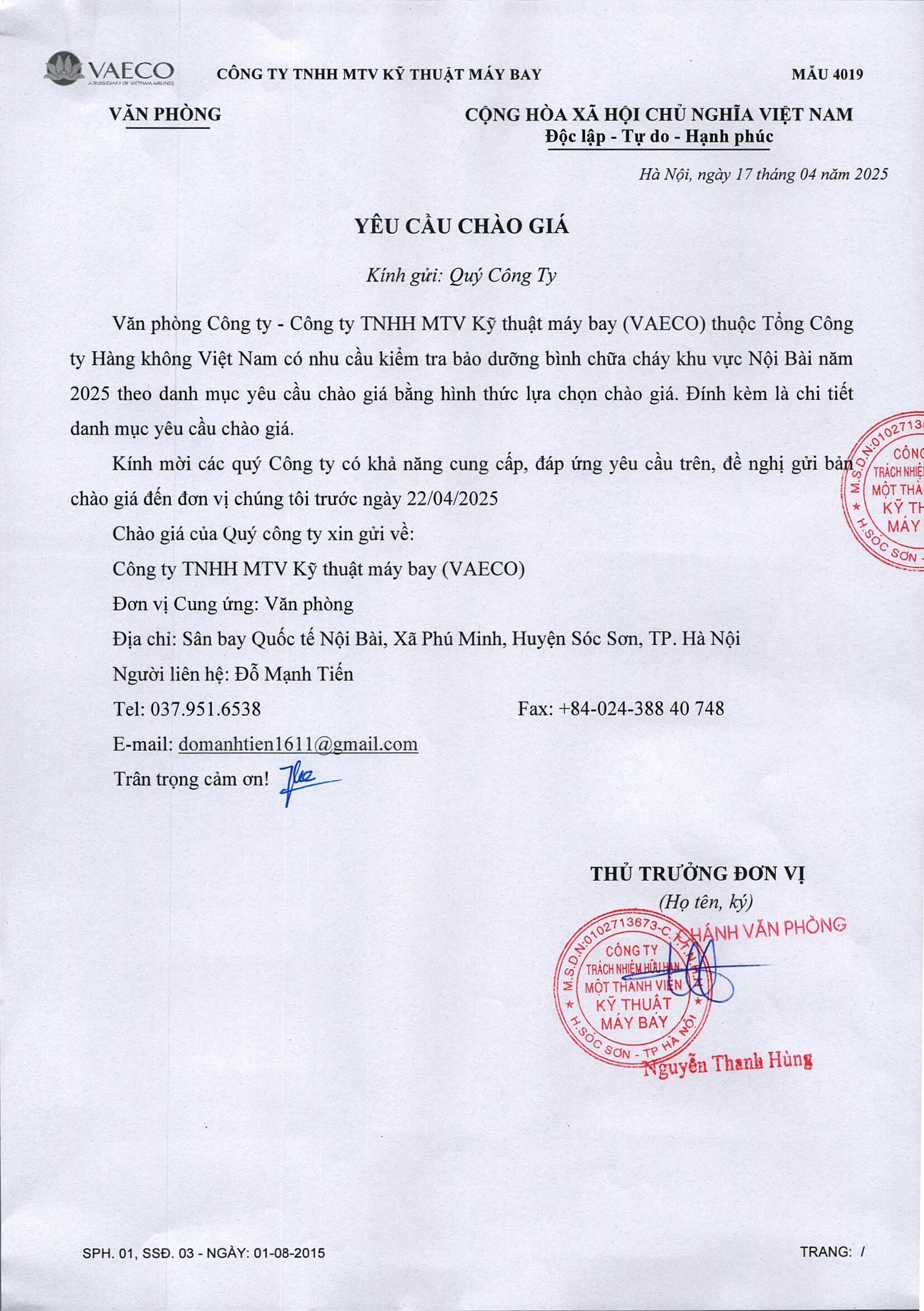 Yêu cầu chào giá gói dịch vụ "Kiểm tra, bảo dưỡng bình chữa cháy khu vực Nội Bài năm 2025""