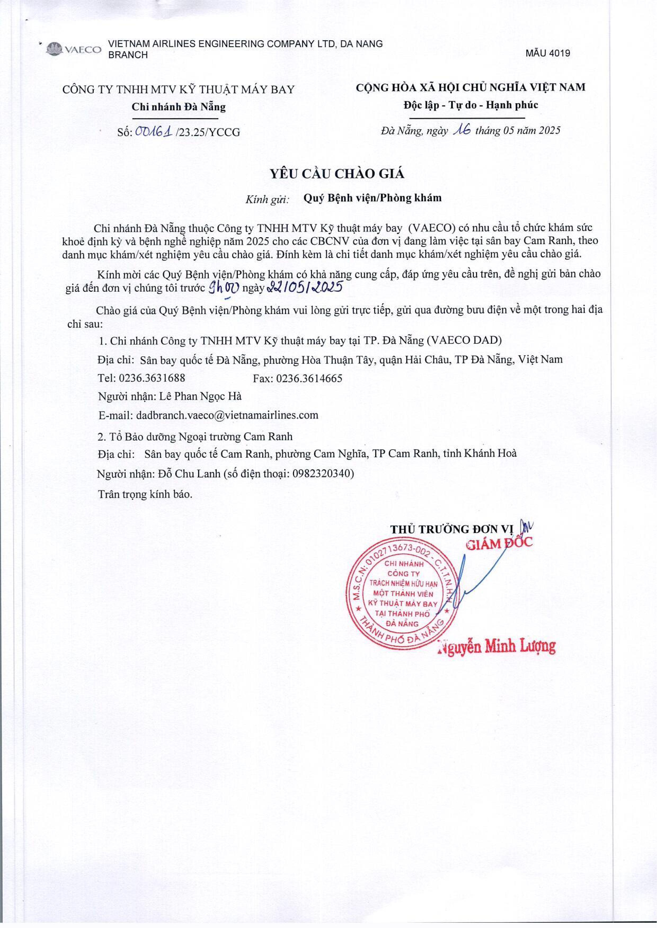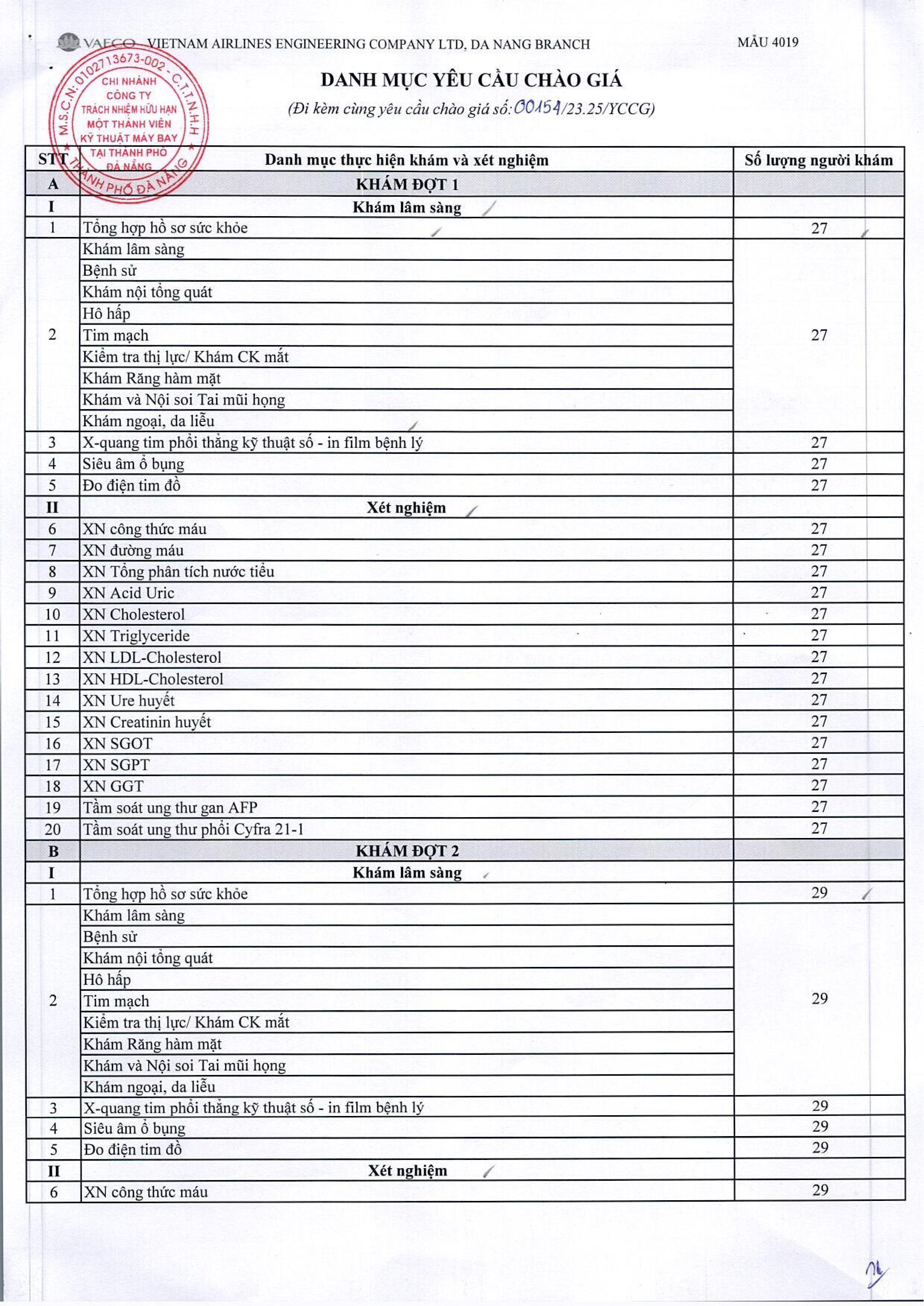 Chi nhánh Đà Nẵng thuộc Công ty TNHH MTV Kỹ thuật máy bay (VAECO) có nhu cầu tổ chức khám sức khoẻ định kỳ và bệnh nghề nghiệp năm 2025 cho các CBCNV của VAECO DAD đang làm việc tại sân bay Cam Ranh, theo danh mục khám/xét nghiệm yêu cầu chào giá. Đính kèm là chi tiết danh mục khám/xét nghiệm yêu cầu chào giá trong file ảnh dưới đây.