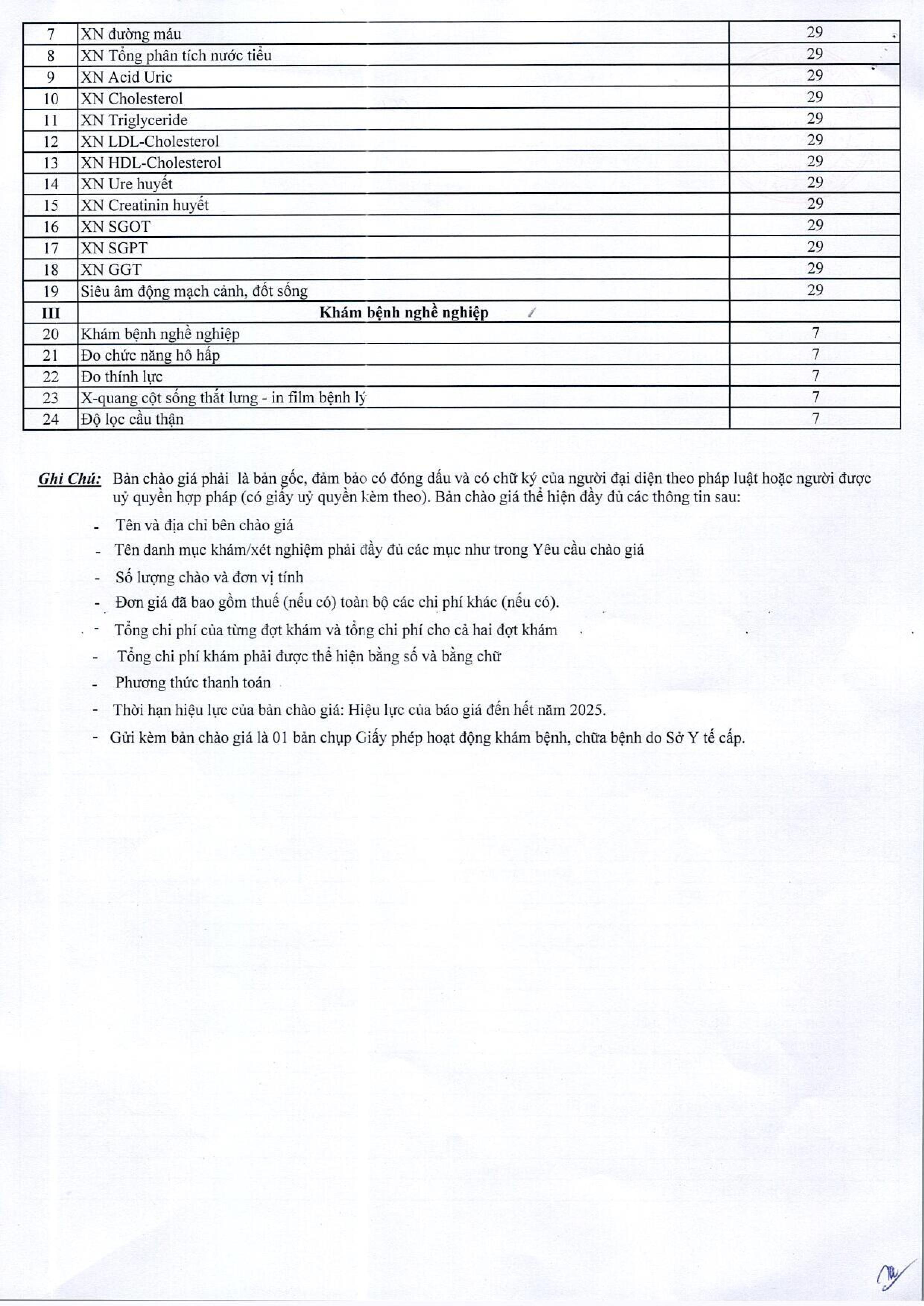 Kính mời các Quý Bệnh viện/Phòng khám có khả năng cung cấp, đáp ứng yêu cầu trên, đề nghị gửi bản chào giá đến đơn vị chúng tôi trước 9h00 ngày 22/05/2025.