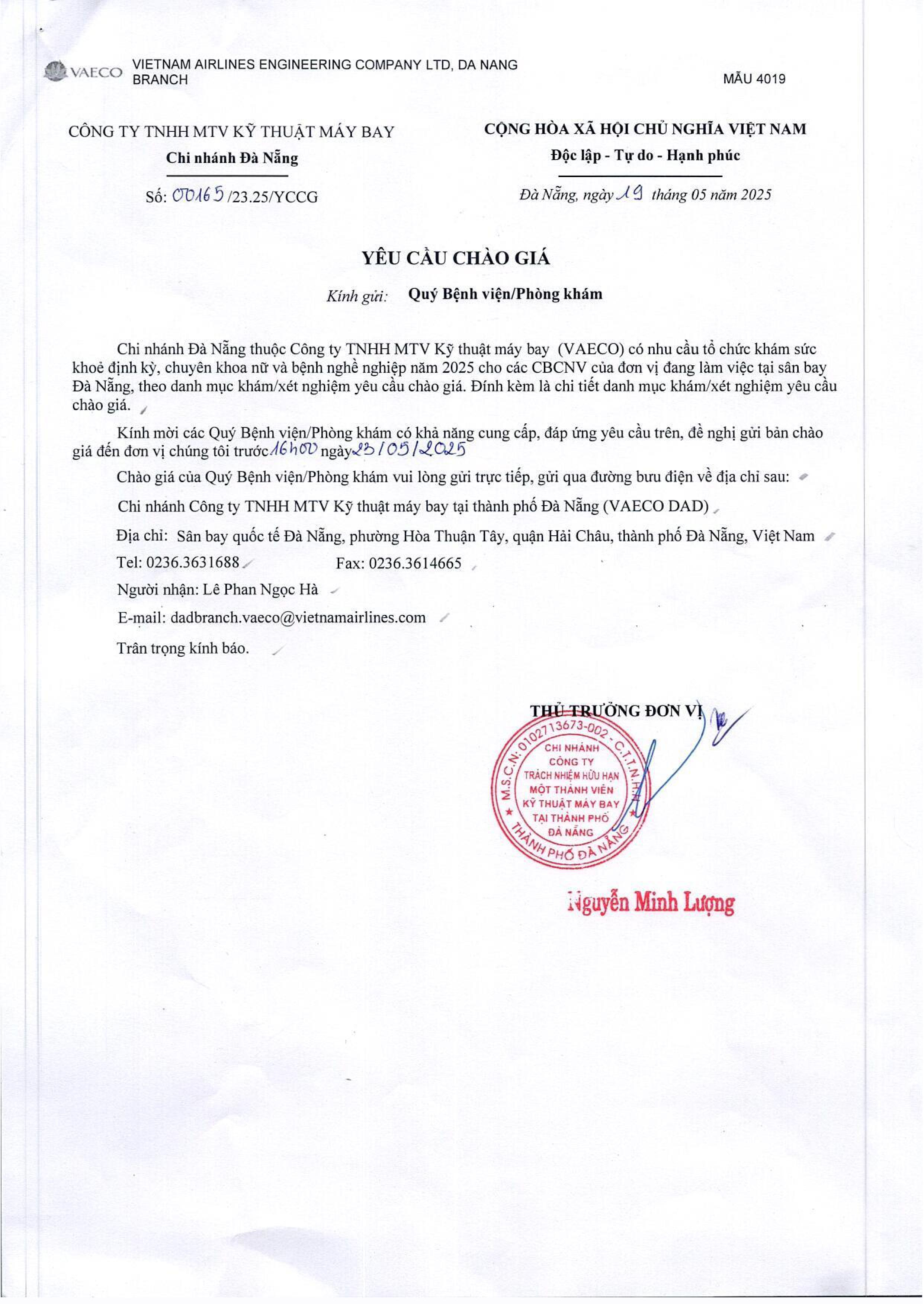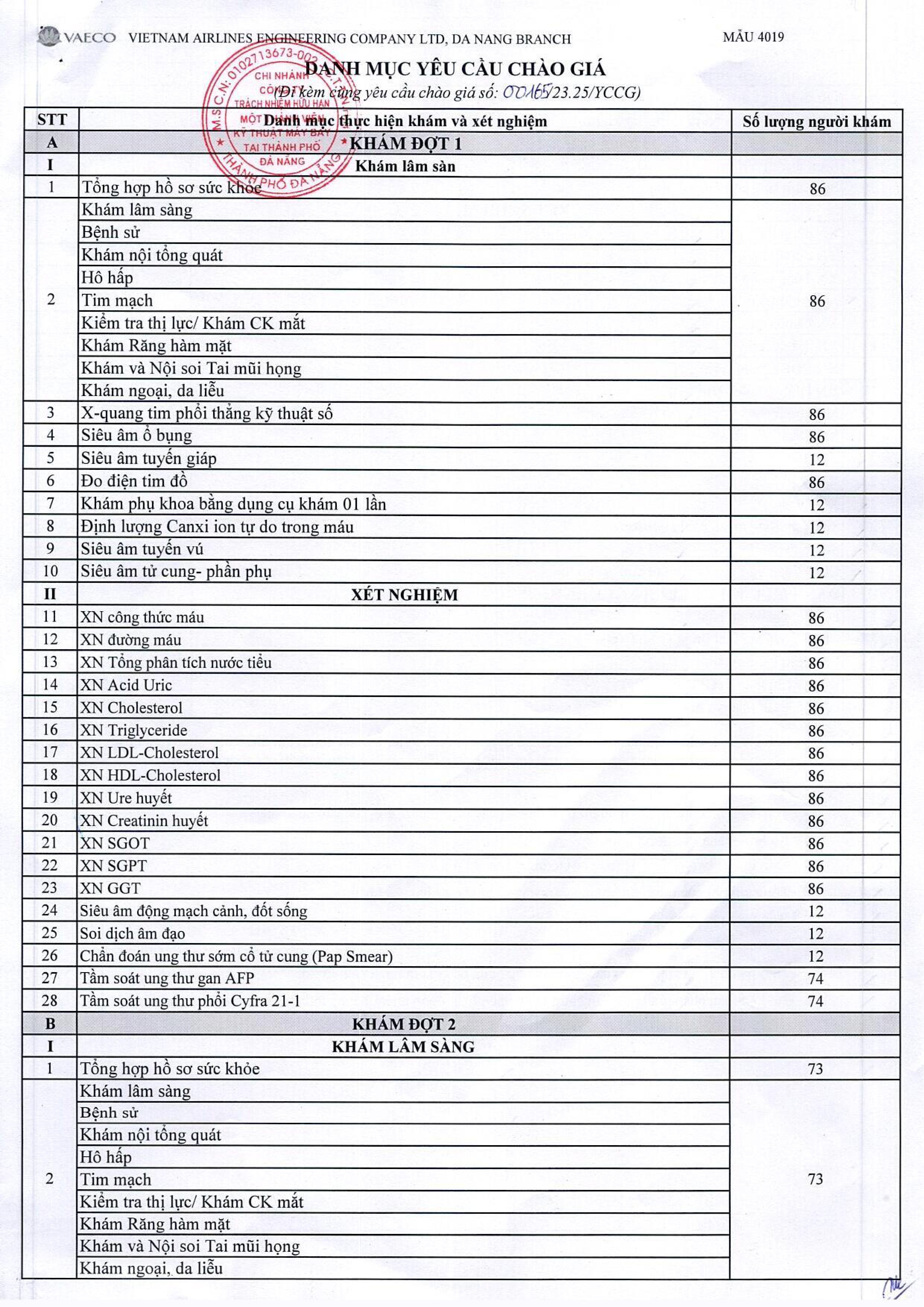 Chi nhánh Đà Nẵng thuộc Công ty TNHH MTV Kỹ thuật máy bay (VAECO) có nhu cầu tổ chức khám sức khoẻ định kỳ, chuyên khoa nữ và bệnh nghề nghiệp năm 2025 cho các CBCNV của VAECO DAD đang làm việc tại sân bay Đà Nẵng, theo danh mục khám/xét nghiệm yêu cầu chào giá. Đính kèm là chi tiết danh mục khám/xét nghiệm yêu cầu chào giá trong file ảnh dưới đây.