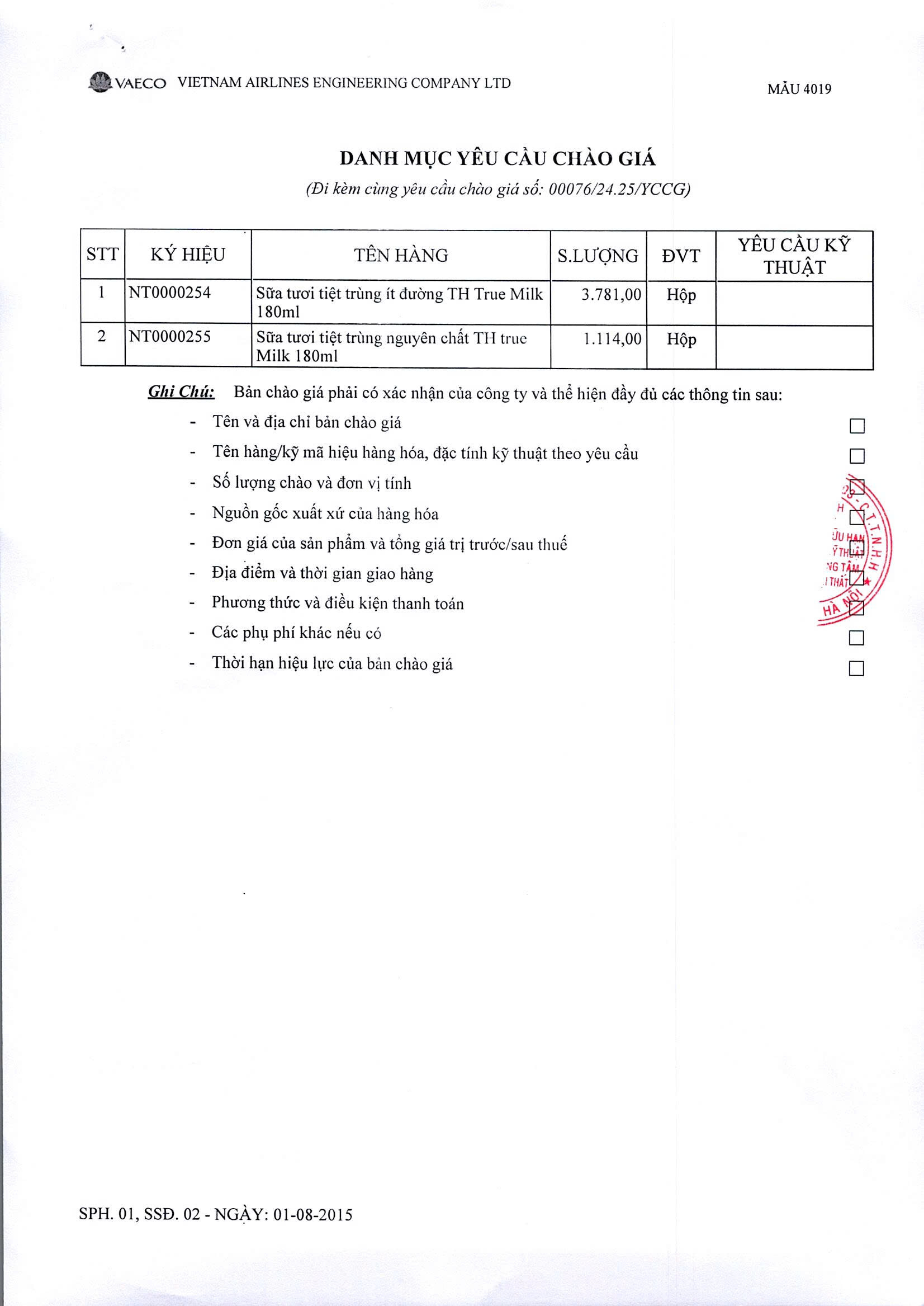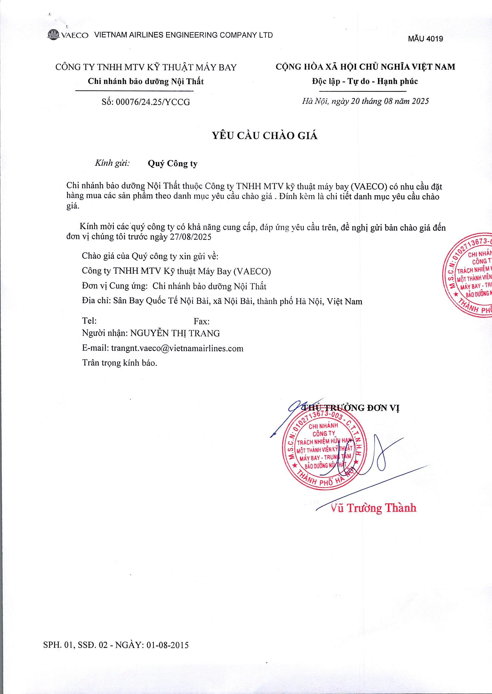 Chi nhánh bảo dưỡng Nội Thất thuộc Công ty TNHH MTV kỹ thuật máy bay (VAECO) có nhu cầu đặt hàng mua các sản phẩm theo danh mục yêu cầu chào giá. Đính kèm là chi tiết danh mục yêu cầu chào giá.