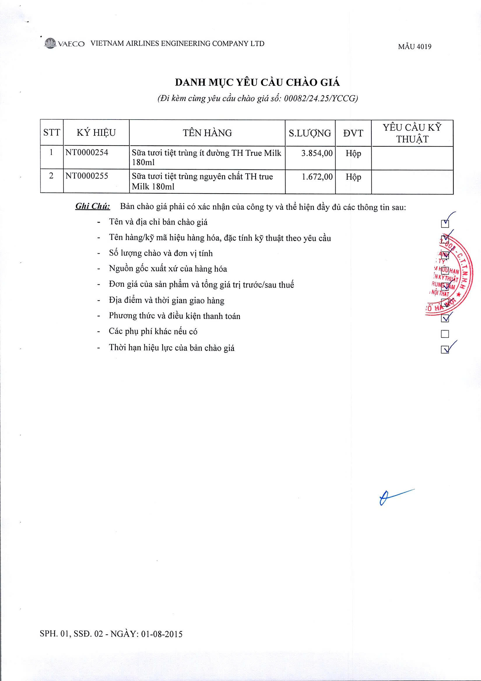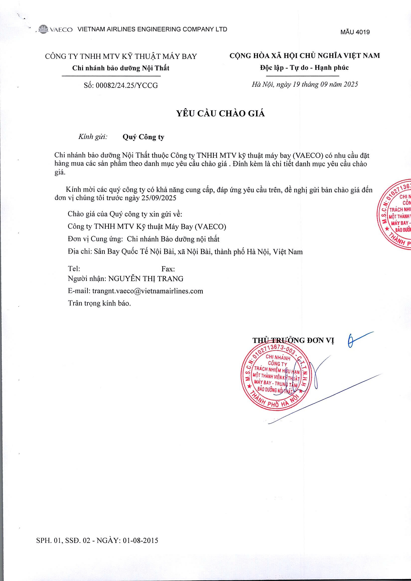 Chi nhánh Bảo dưỡng Nội Thất thuộc Công ty TNHH MTV Kỹ thuật Máy bay (VAECO) có nhu cầu đặt hàng mua các sản phẩm theo danh mục yêu cầu chào giá. Đính kèm là chi tiết danh mục yêu cầu chào giá.