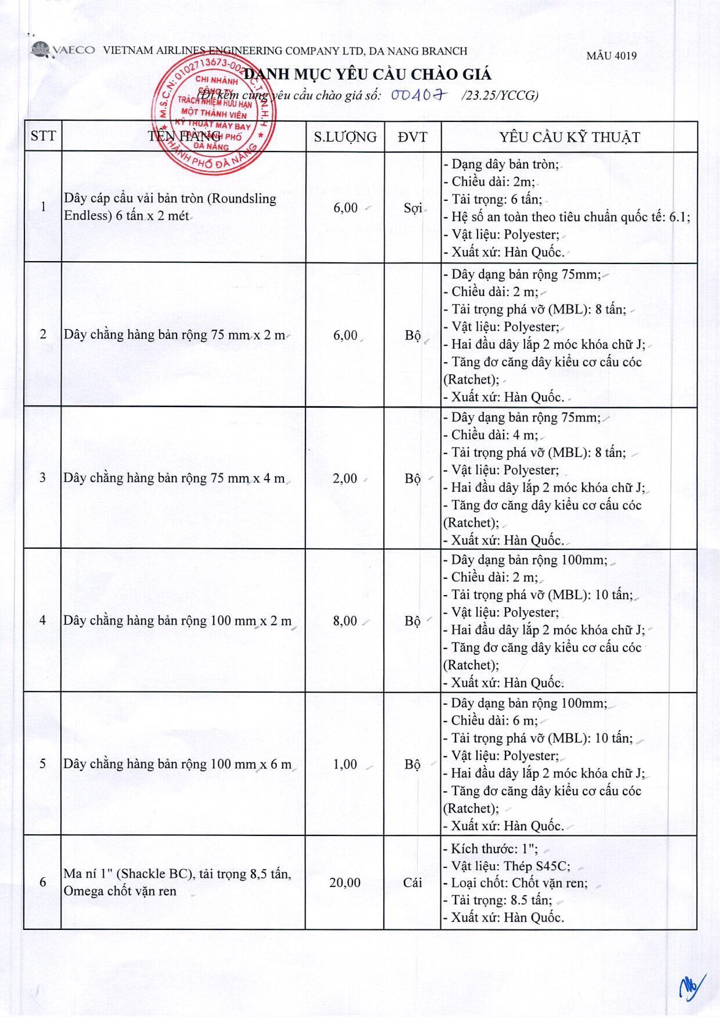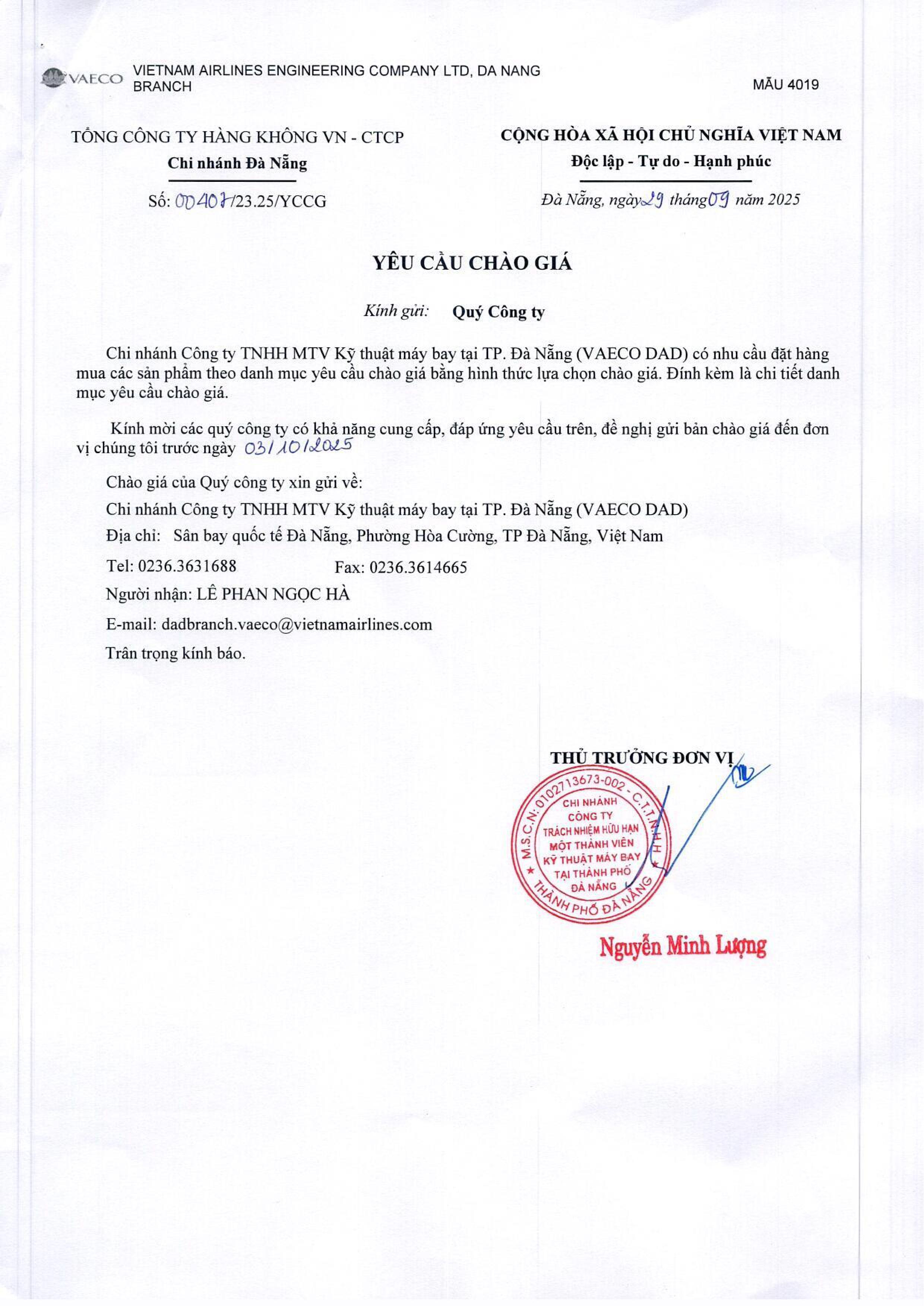 Chi nhánh Công ty TNHH MTV Kỹ thuật máy bay tại TP. Đà Nẵng (VAECO DAD) có nhu cầu đặt hàng mua các sản phẩm theo danh mục yêu cầu chào giá bằng hình thức lựa chọn chào giá. Đính kèm là chi tiết danh mục yêu cầu chào giá.