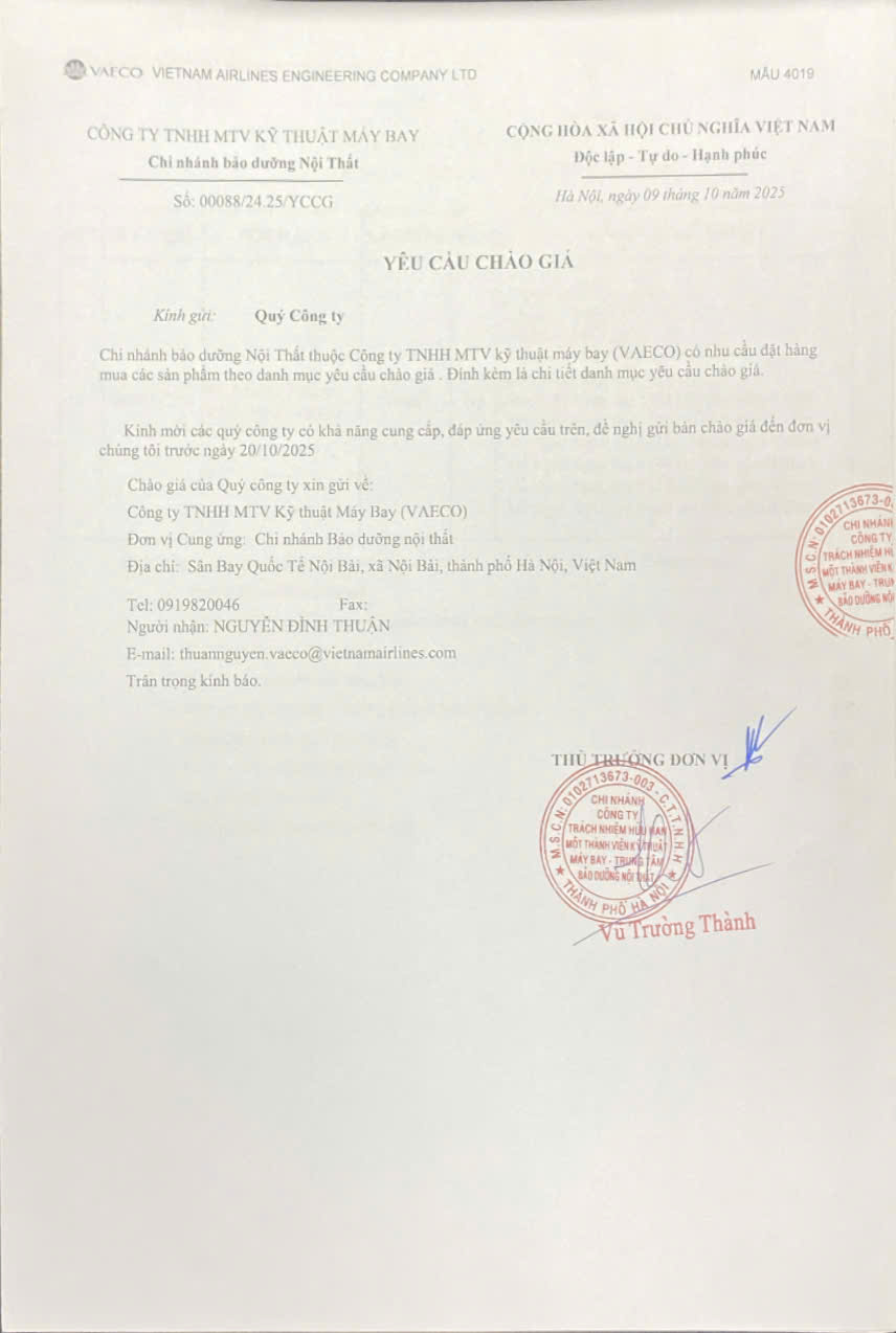 Chi nhánh bảo dưỡng Nội Thất thuộc Công ty TNHH MTV kỹ thuật máy bay (VAECO) có nhu cầu đặt hàng mua các sản phẩm theo danh mục yêu cầu chào giá . Đính kèm là chi tiết danh mục yêu cầu chào giá.