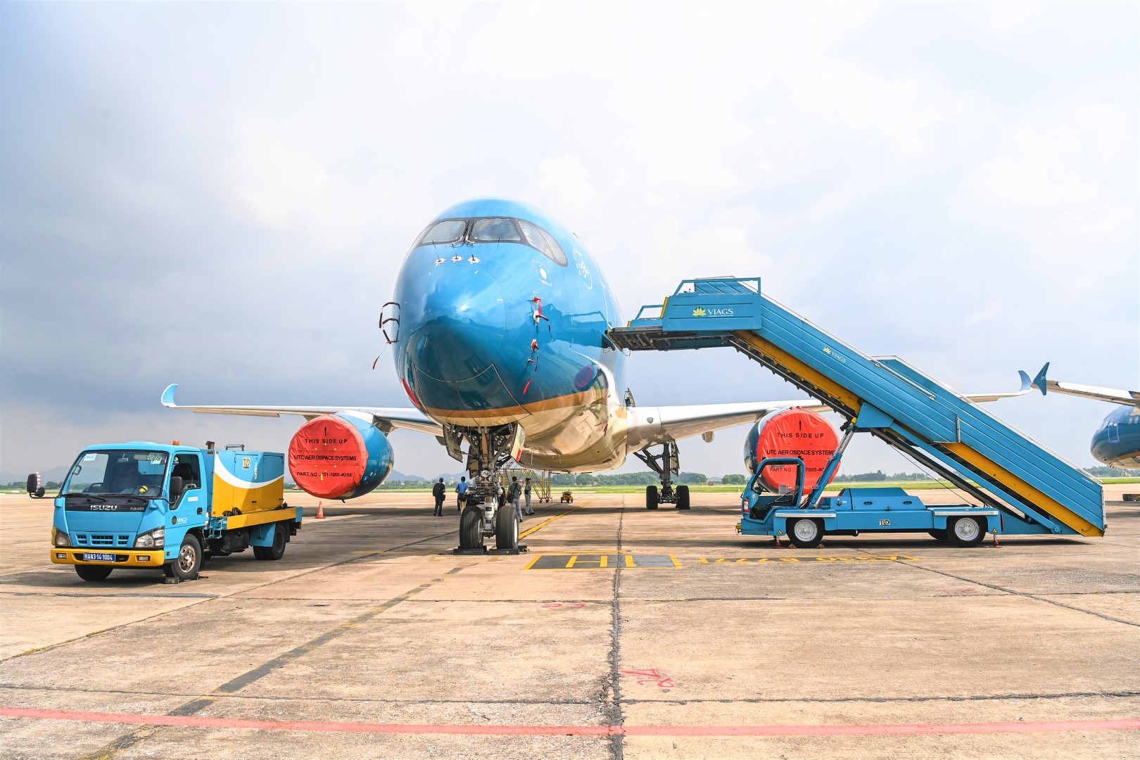 Bạt che động cơ được gỡ bỏ khi tàu bay chuẩn bị khai thác trở lại. (Ảnh: VNA).