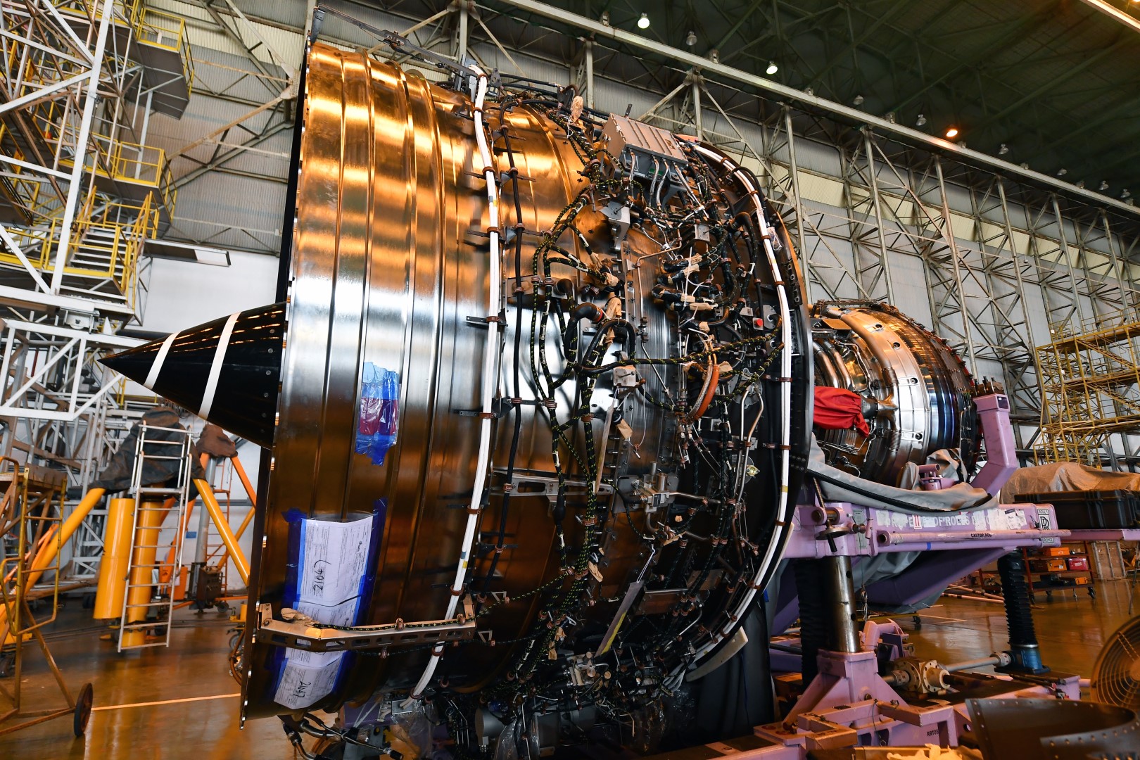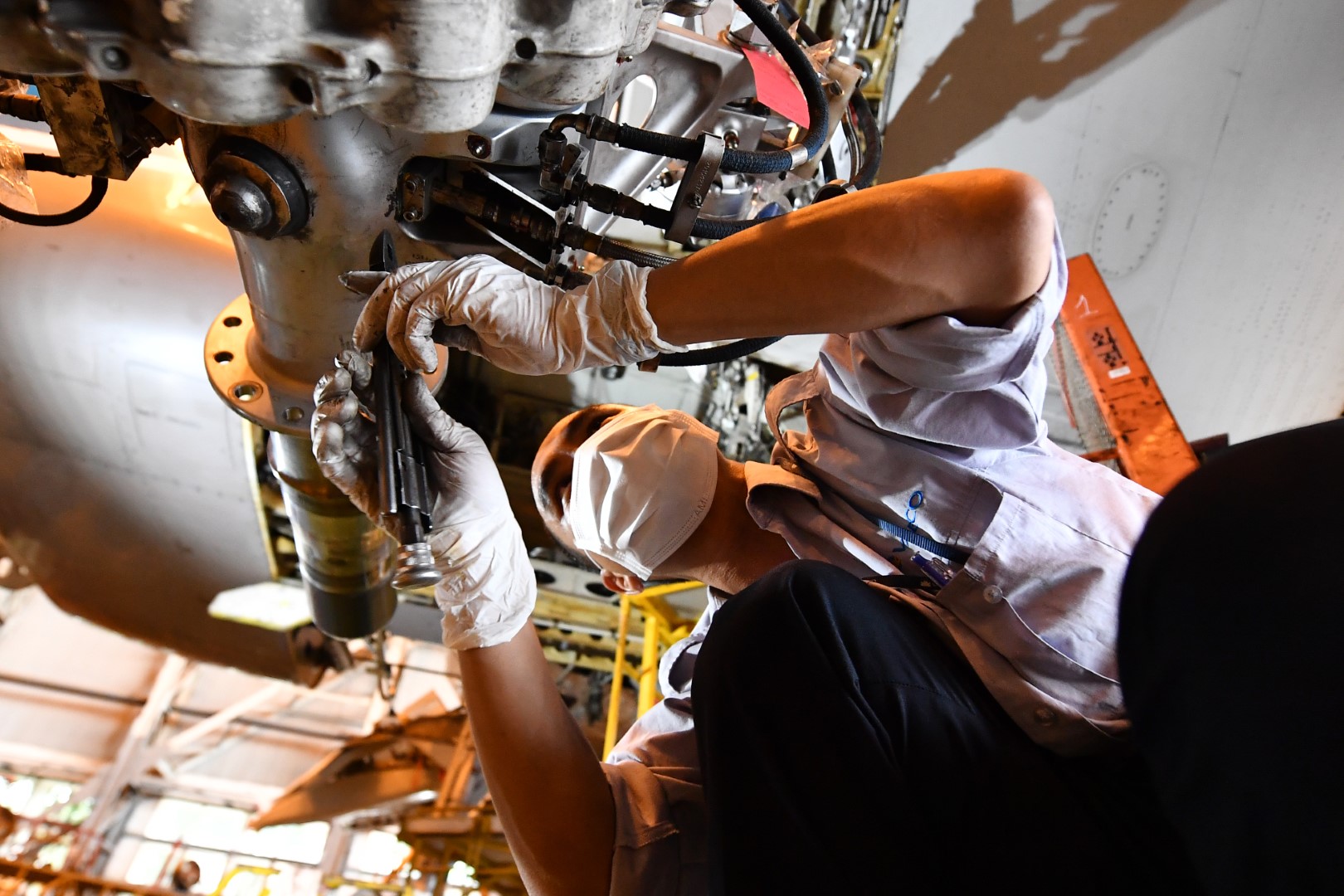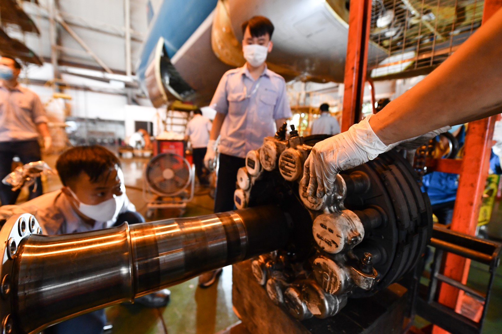 Nhân viên kỹ thuật đang lắp lại (build up) một khối động cơ. Động cơ tàu bay có kích thước rất lớn nên khi di chuyển đi đại tu, phải tách nhỏ thành các phần khác nhau và lắp lại thành khối hoàn chỉnh sau đó. Động cơ trong hình là động cơ phản lực Rolls-Royce của máy bay Airbus A350 thuộc đội bay VNA – một trong những dòng máy bay lớn nhất ở Việt Nam hiện nay với sức tải hơn 300 khách.