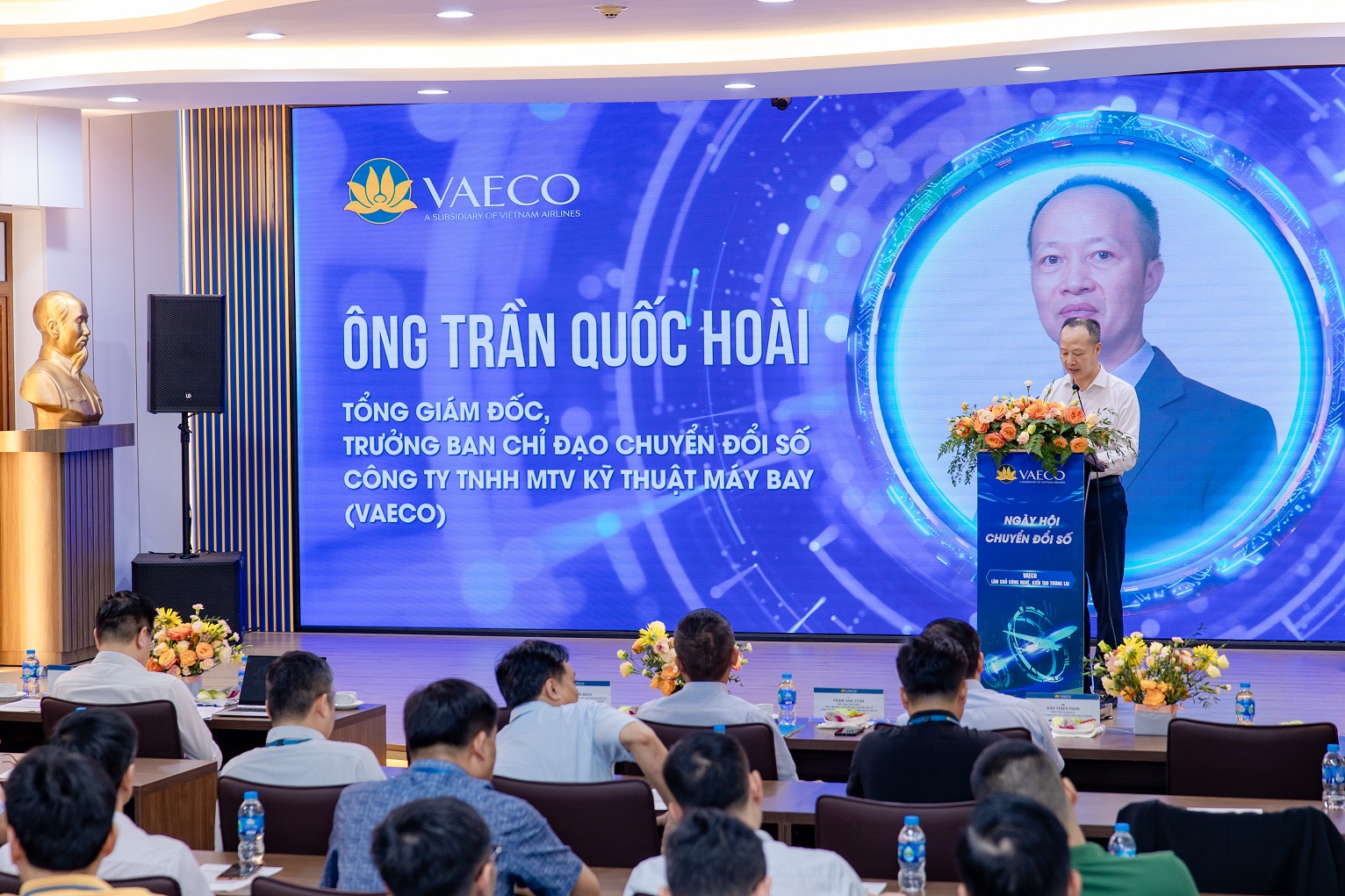 Phát biểu khai mạc, ông Trần Quốc Hoài – Tổng Giám đốc VAECO – nhấn mạnh Ngày hội Chuyển đổi số là bước khởi đầu cho hành trình chuyển mình toàn diện của VAECO. Ông khẳng định chuyển đổi số không bắt đầu từ phần mềm, mà bắt đầu từ con người – từ tư duy, tinh thần đổi mới và khát vọng tạo giá trị mới. Với vai trò doanh nghiệp kỹ thuật hàng không hàng đầu, VAECO phải tiên phong thích ứng, không chỉ để theo kịp mà để dẫn đầu.