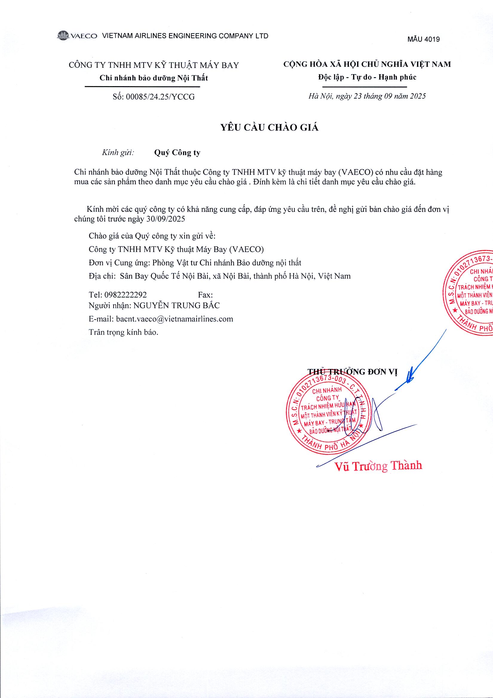 Chi nhánh bảo dưỡng Nội Thất thuộc Công ty TNHH MTV kỹ thuật máy bay (VAECO) có nhu cầu đặt hàng mua các sản phẩm theo danh mục yêu cầu chào giá . Đính kèm là chi tiết danh mục yêu cầu chào giá.