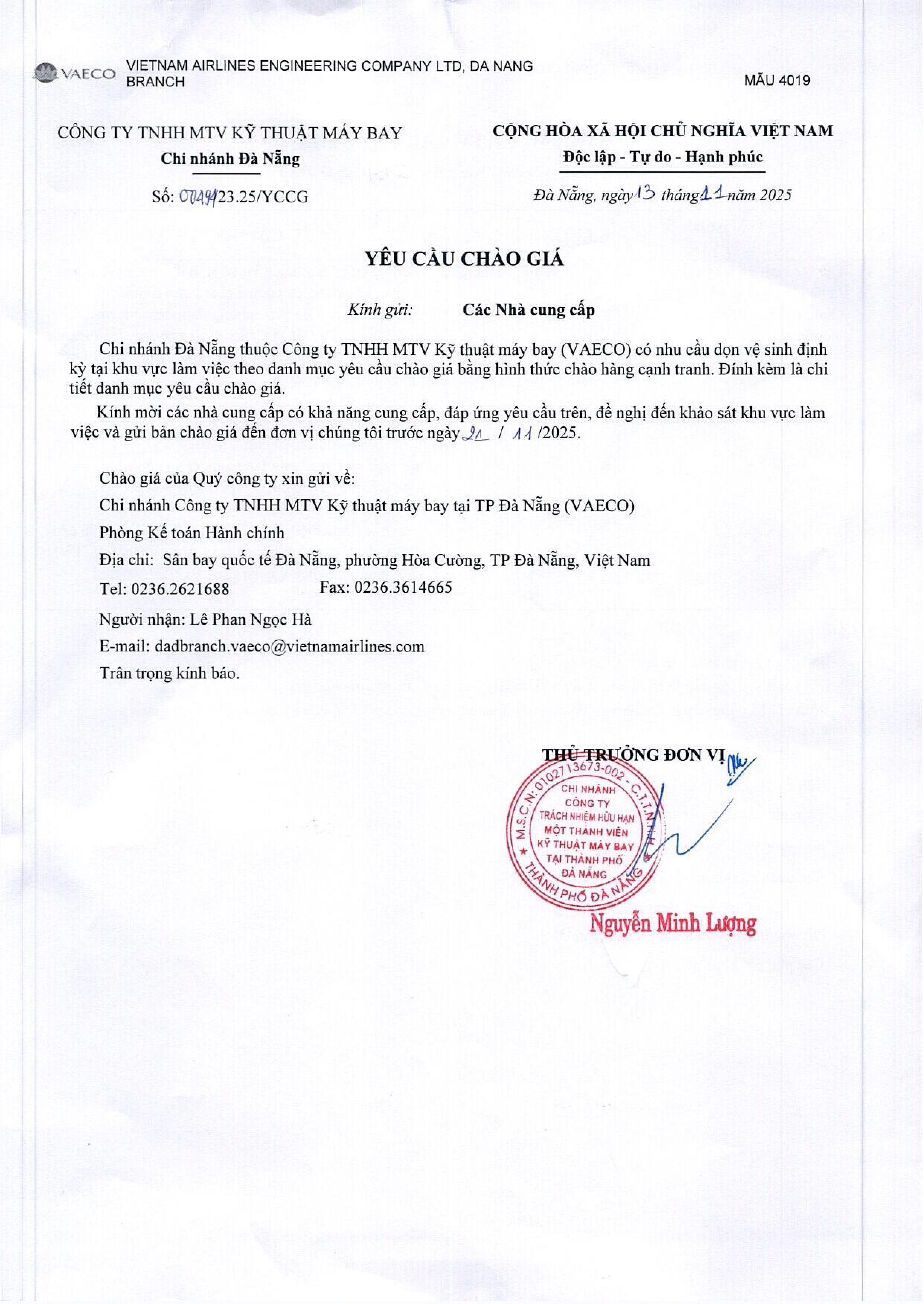Chi nhánh Đà Nẵng thuộc Công ty TNHH MTV Kỹ thuật máy bay (VAECO) có nhu cầu dọn vệ sinh định kỳ tại khu vực làm việc theo danh mục yêu cầu chào giá bằng hình thức chào hàng cạnh tranh. Đính kèm là chi tiết danh mục yêu cầu chào giá.