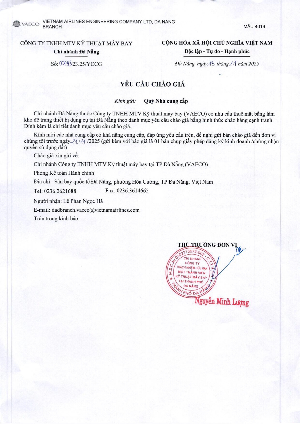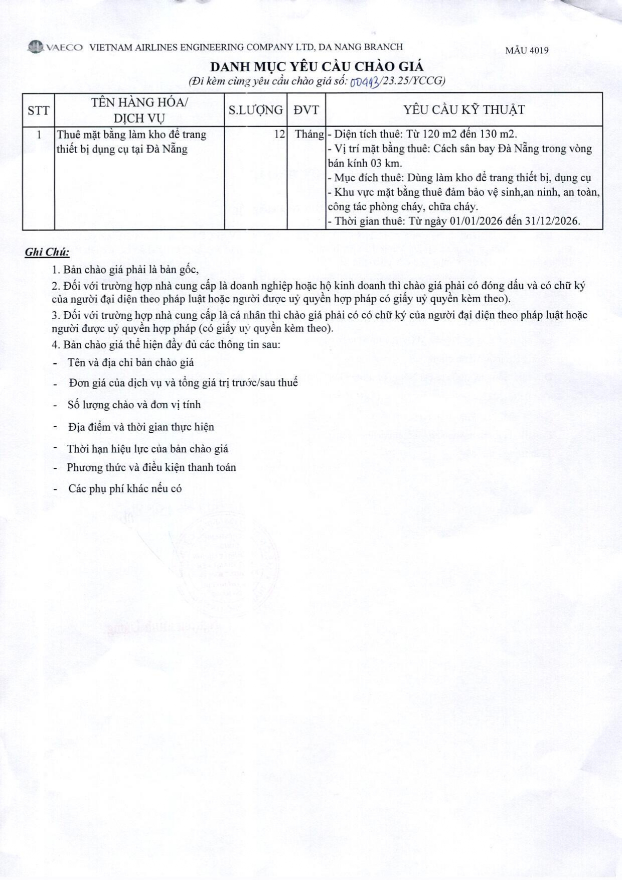 Chi nhánh Đà Nẵng thuộc Công ty TNHH MTV Kỹ thuật máy bay (VAECO) có nhu cầu thuê mặt bằng làm kho để trang thiết bị dụng cụ tại Đà Nẵng theo danh mục yêu cầu chào giá bằng hình thức chào hàng cạnh tranh. Đính kèm là chi tiết danh mục yêu cầu chào giá.