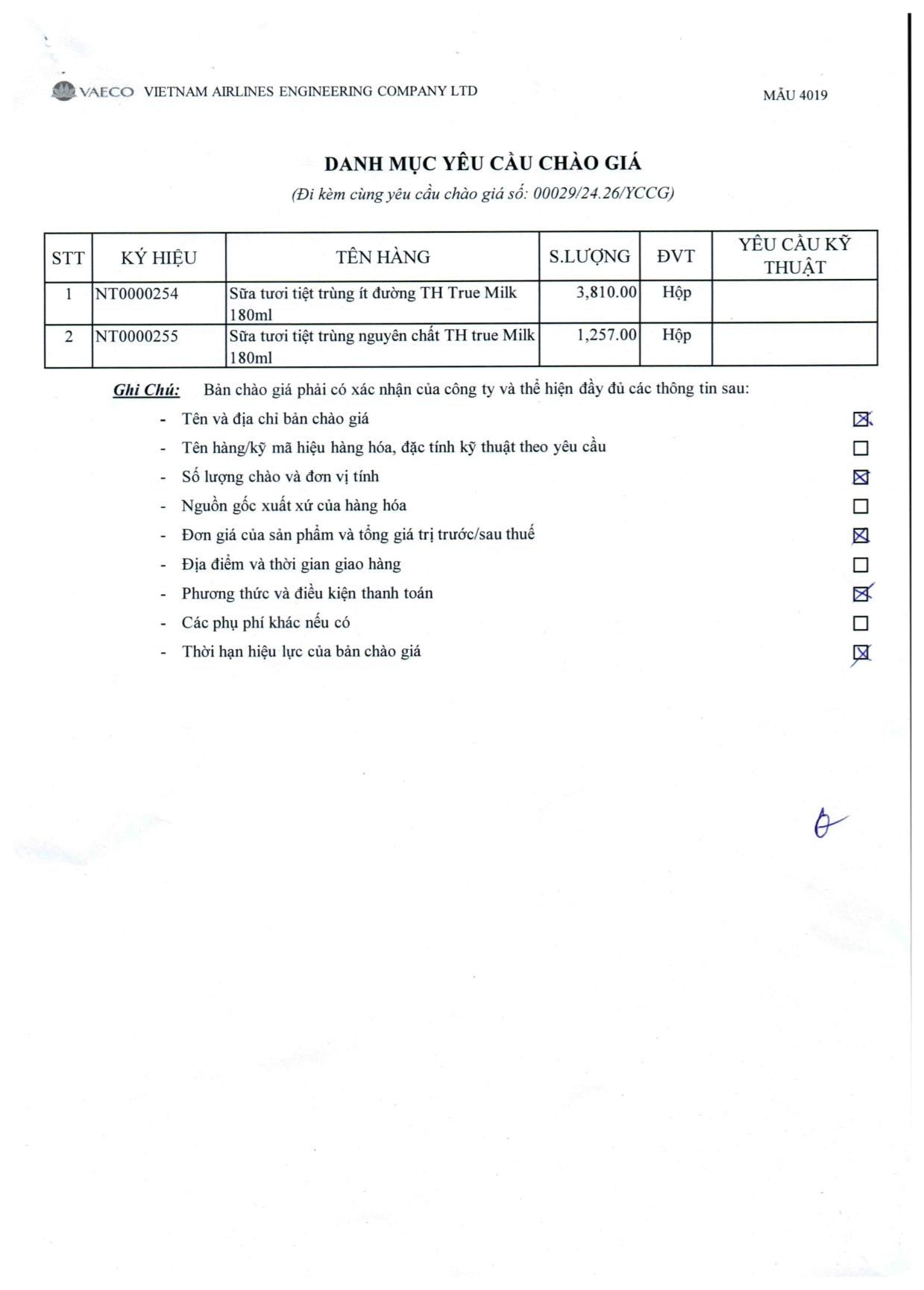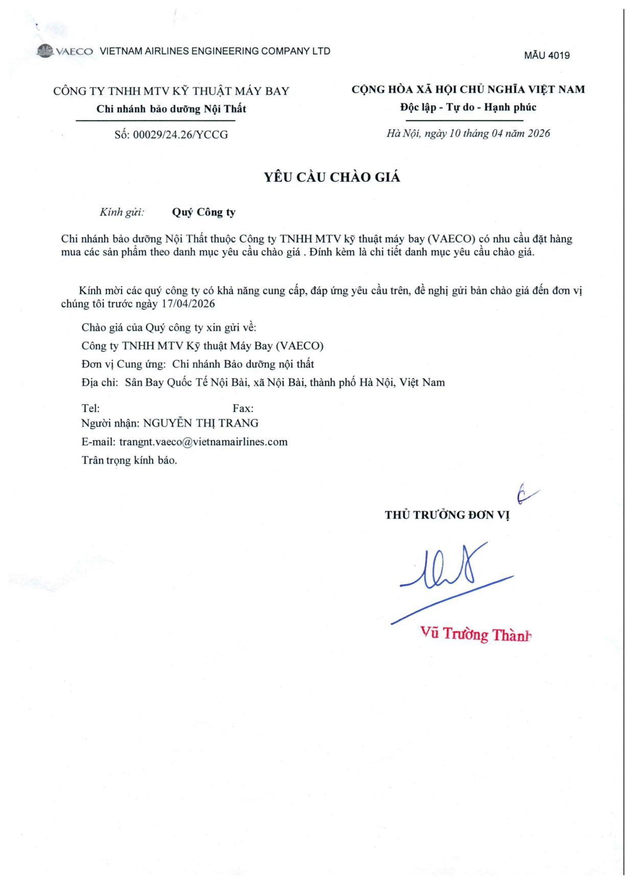 Chi nhánh Bảo dưỡng Nội Thất thuộc Công ty TNHH MTV Kỹ thuật Máy bay (VAECO) có nhu cầu đặt hàng mua các sản phẩm theo danh mục yêu cầu chào giá. Đính kèm là chi tiết danh mục yêu cầu chào giá.