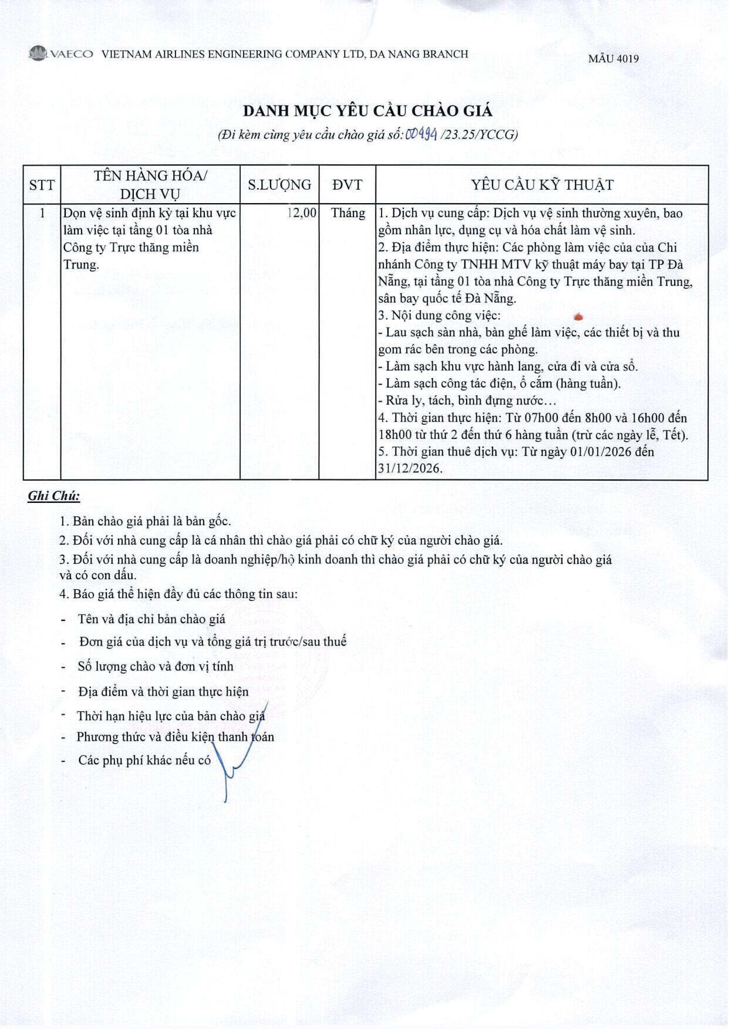 Chi nhánh Đà Nẵng thuộc Công ty TNHH MTV Kỹ thuật máy bay (VAECO) có nhu cầu dọn vệ sinh định kỳ tại khu vực làm việc theo danh mục yêu cầu chào giá bằng hình thức chào hàng cạnh tranh. Đính kèm là chi tiết danh mục yêu cầu chào giá.