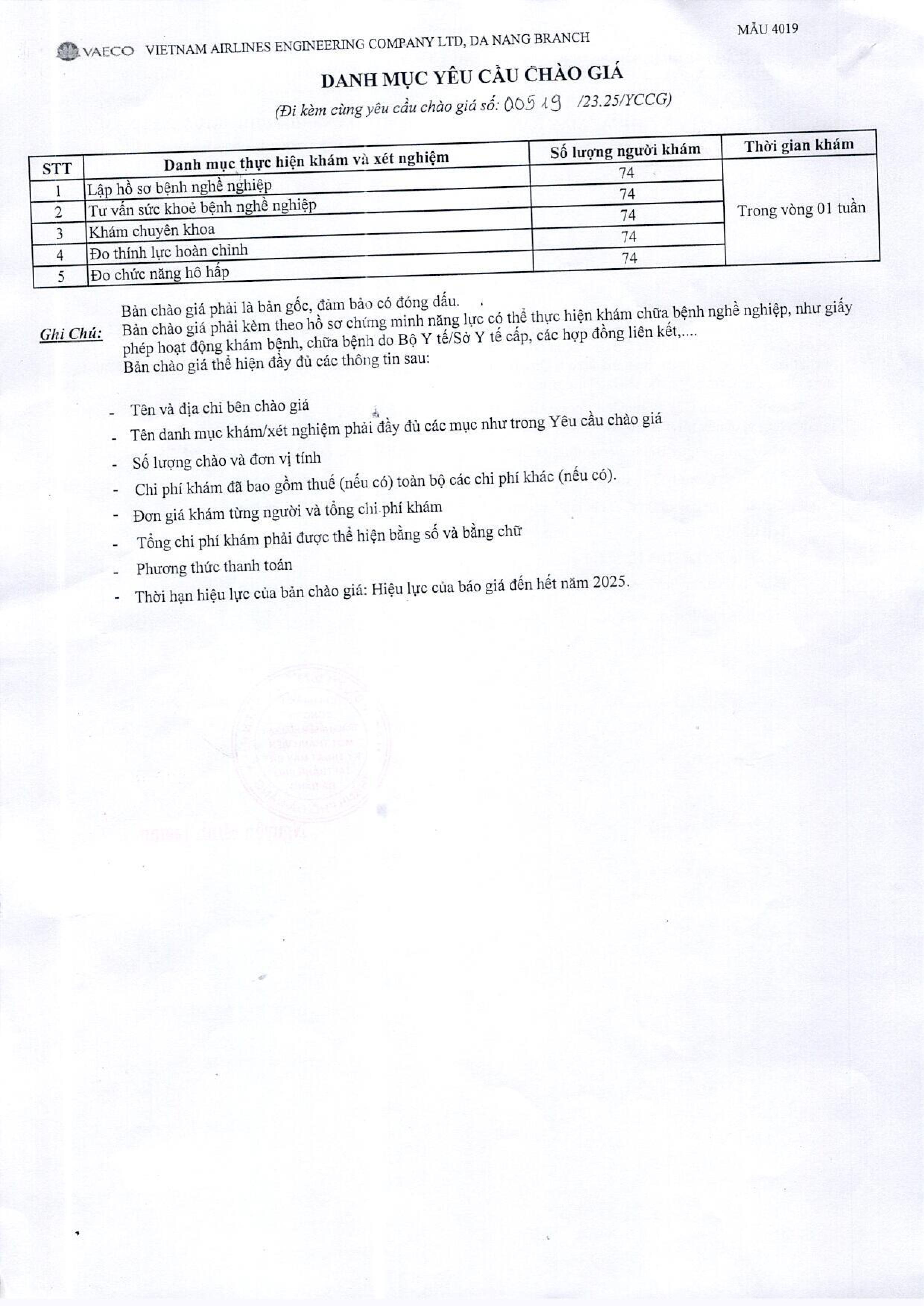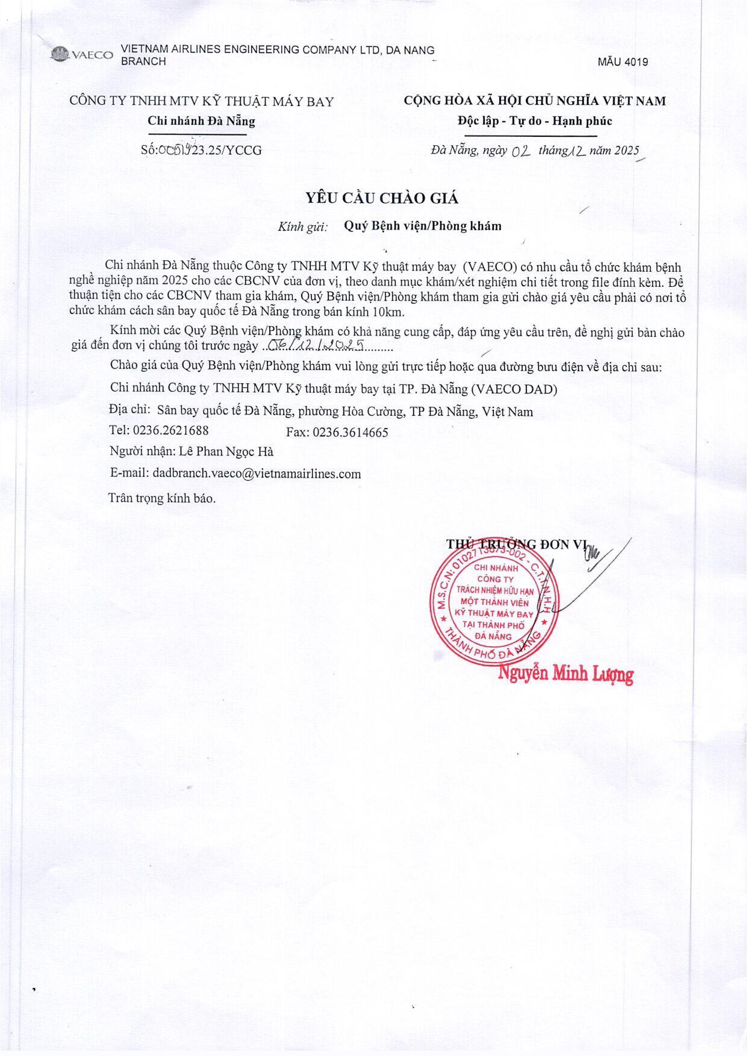 Chi nhánh Đà Nẵng thuộc Công ty TNHH MTV Kỹ thuật máy bay (VAECO) có nhu cầu tổ chức khám bệnh nghề nghiệp năm 2025 cho các CBCNV của đơn vị tại sân bay Đà Nẵng, theo danh mục khám/xét nghiệm chi tiết trong file đính kèm. Kính mời các Quý Bệnh viện/Phòng khám có khả năng cung cấp, đáp ứng yêu cầu trên, đề nghị gửi bản chào giá đến đơn vị chúng tôi trước ngày 06/12/2025.