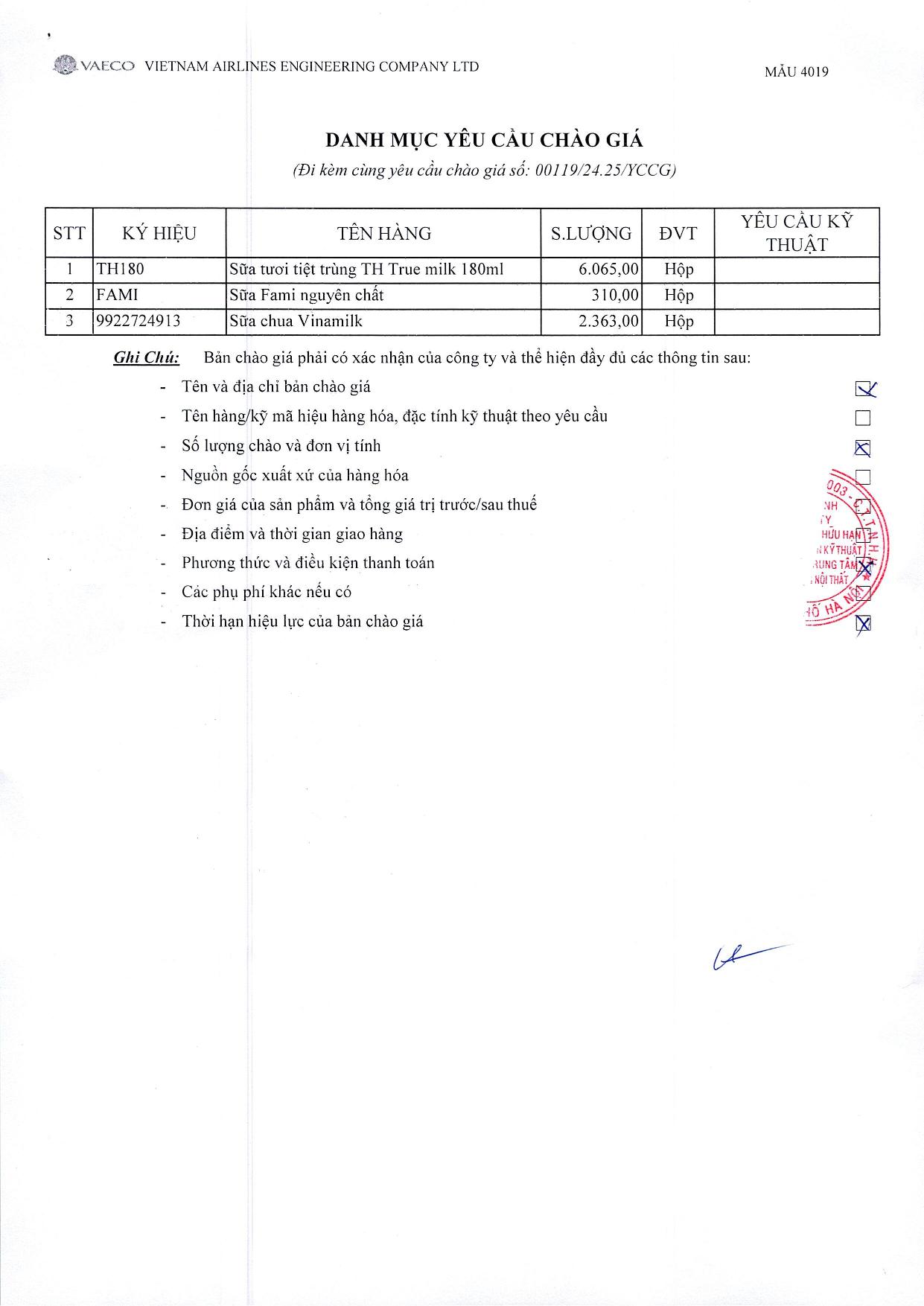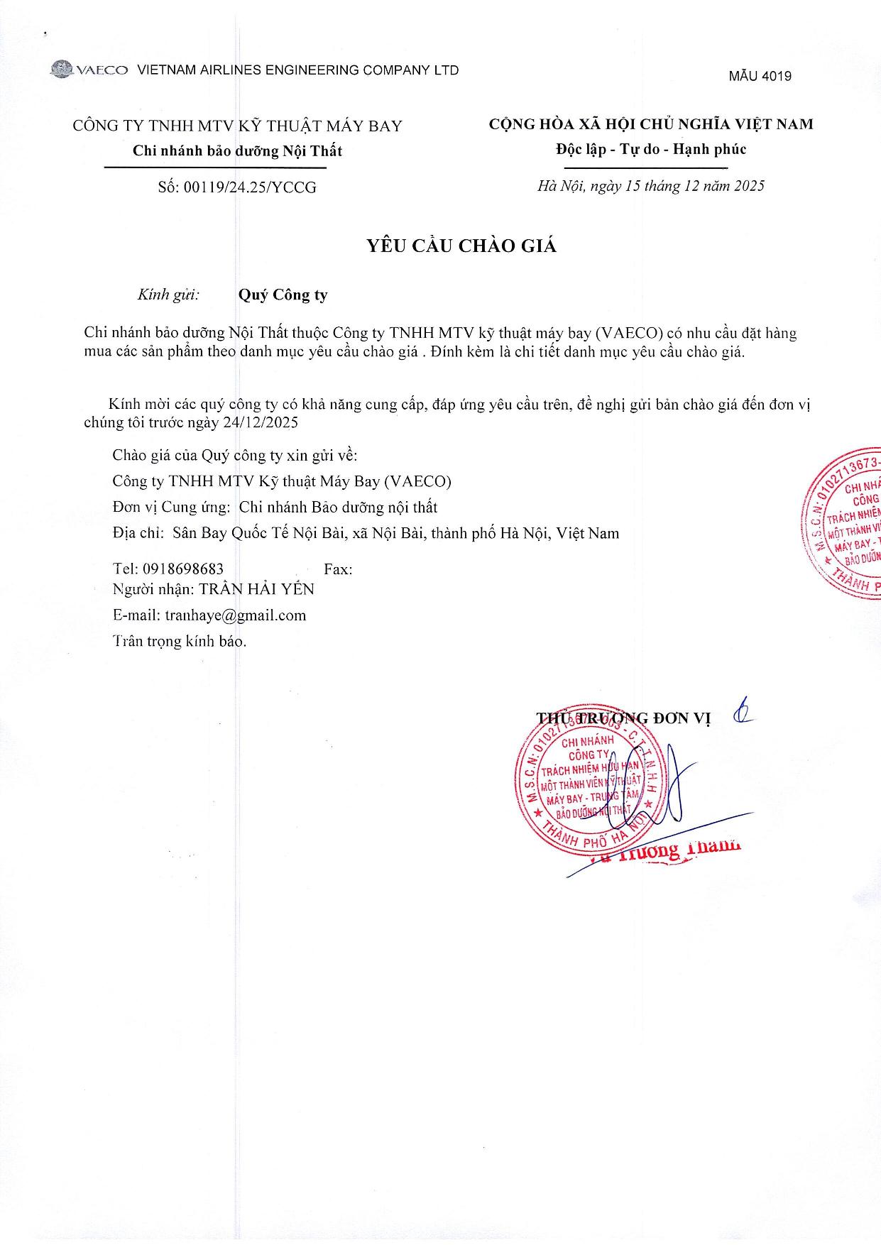 Chi nhánh Bảo dưỡng Nội Thất thuộc Công ty TNHH MTV Kỹ thuật Máy bay (VAECO) có nhu cầu đặt hàng mua các sản phẩm theo danh mục yêu cầu chào giá. Đính kèm là chi tiết danh mục yêu cầu chào giá.