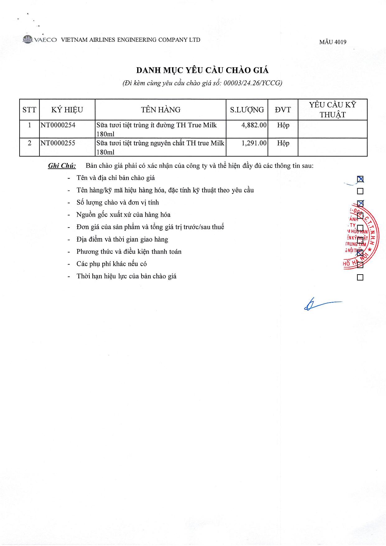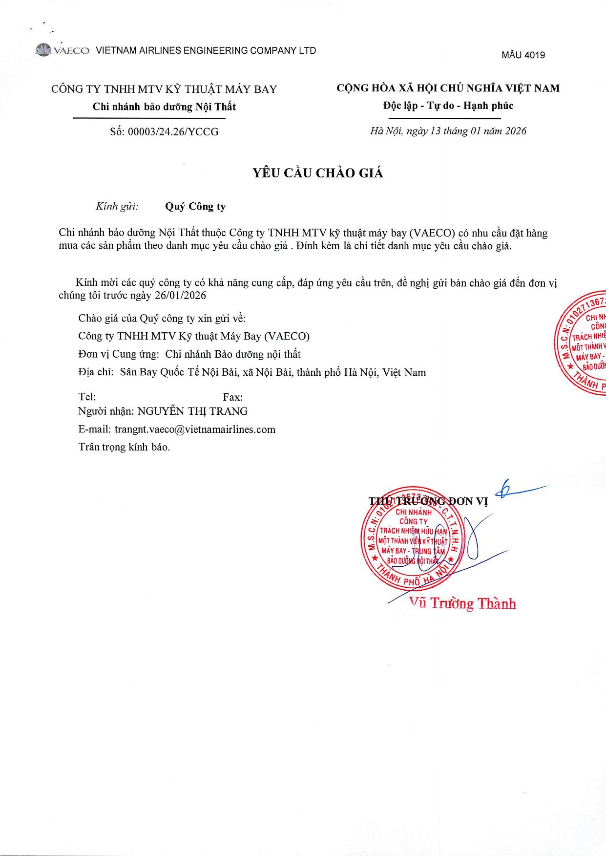 Chi nhánh Bảo dưỡng Nội Thất thuộc Công ty TNHH MTV Kỹ thuật Máy bay (VAECO) có nhu cầu đặt hàng mua các sản phẩm theo danh mục yêu cầu chào giá. Đính kèm là chi tiết danh mục yêu cầu chào giá.