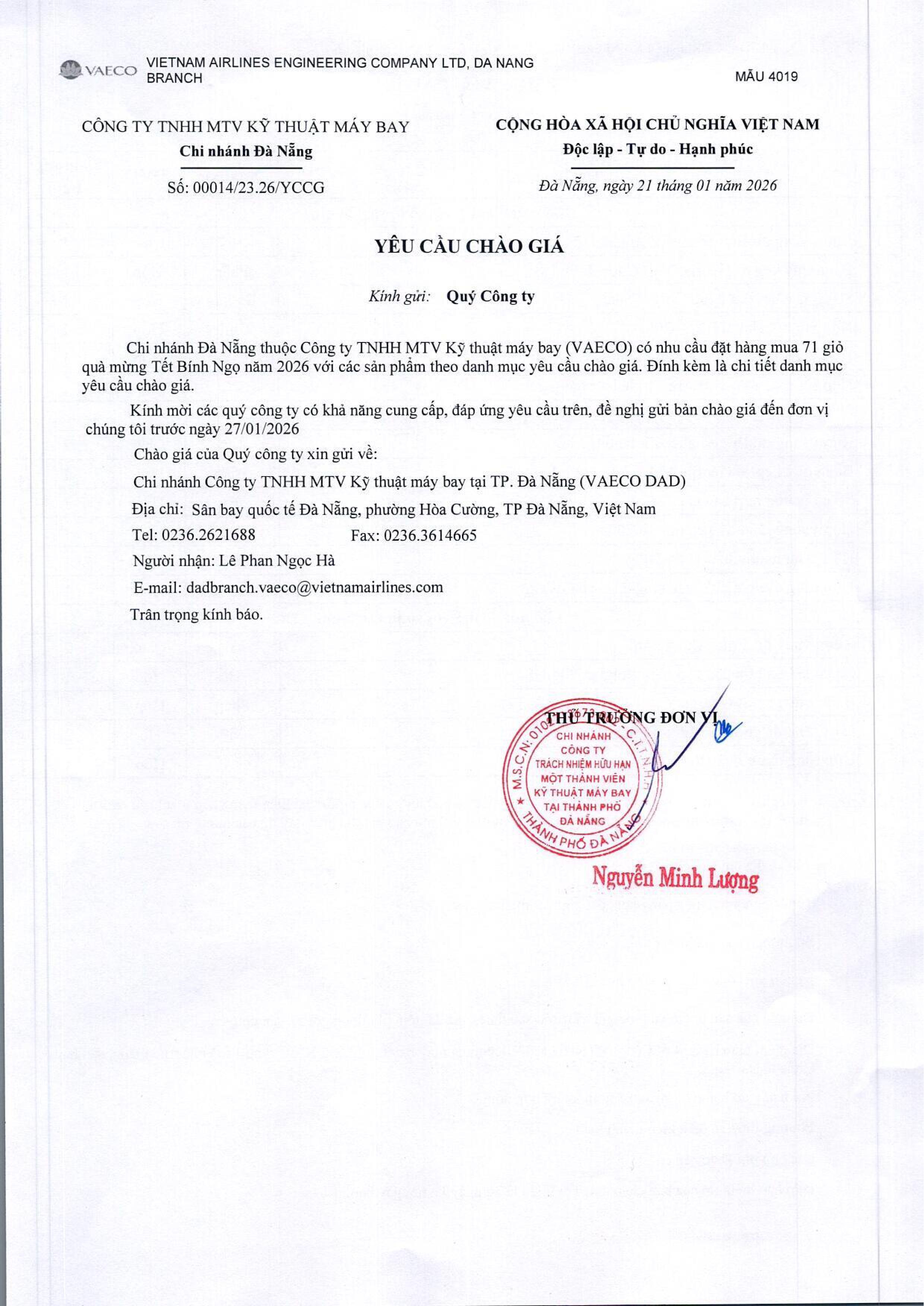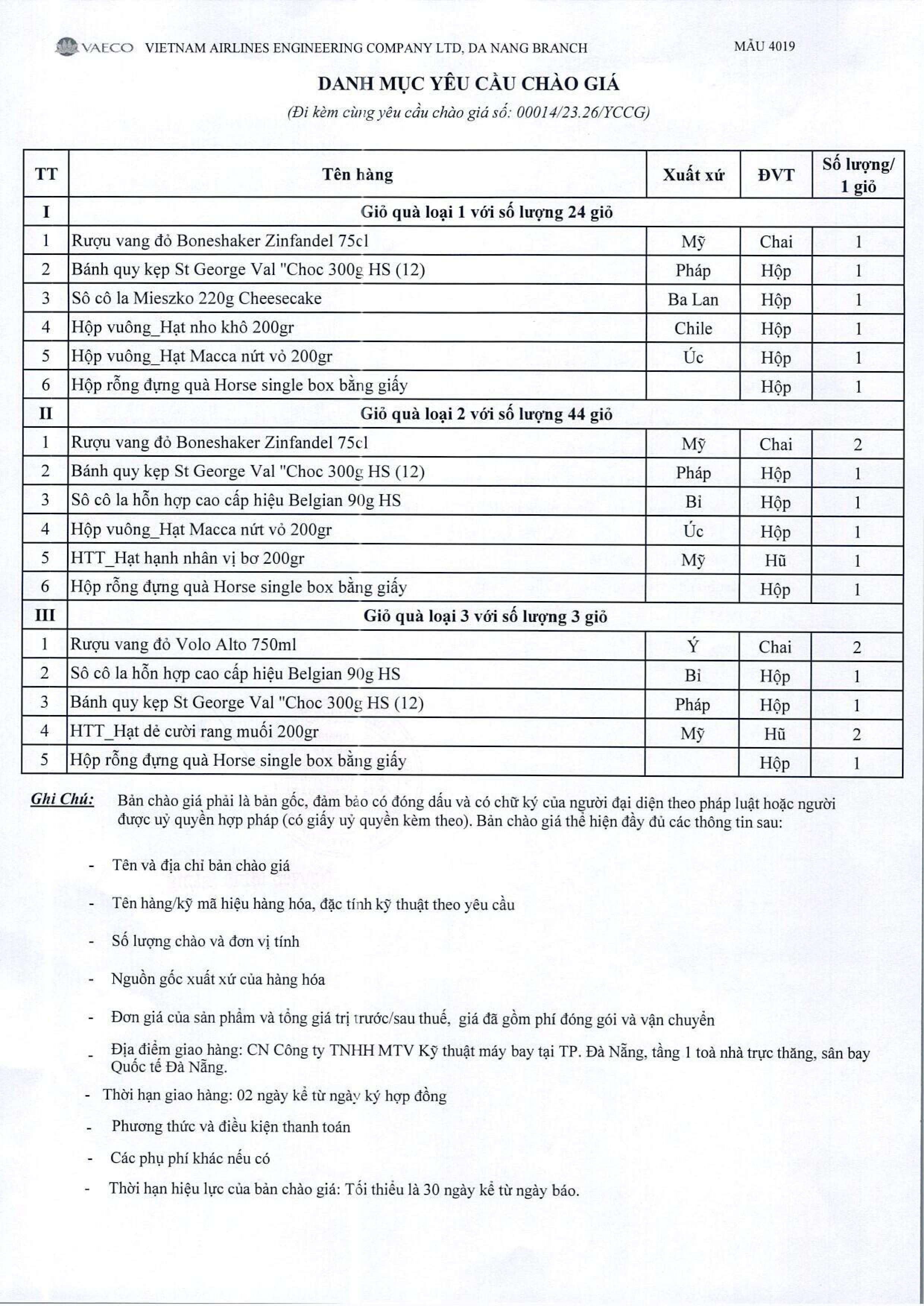 Chi nhánh Đà Nẵng thuộc Công ty TNHH MTV Kỹ thuật máy bay (VAECO) có nhu cầu đặt hàng mua 71 giỏ quà mừng Tết Bính Ngọ năm 2026 với các sản phẩm theo danh mục yêu cầu chào giá. Đính kèm là chi tiết danh mục yêu cầu chào giá.